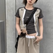 クロップド Tシャツ レディース スポーティー カラーブロック 韓国 ファッション チビT 夏トップス カジュアル