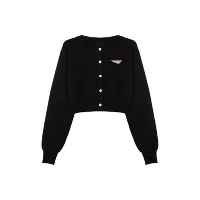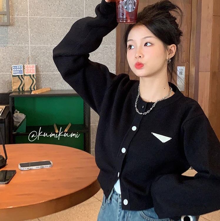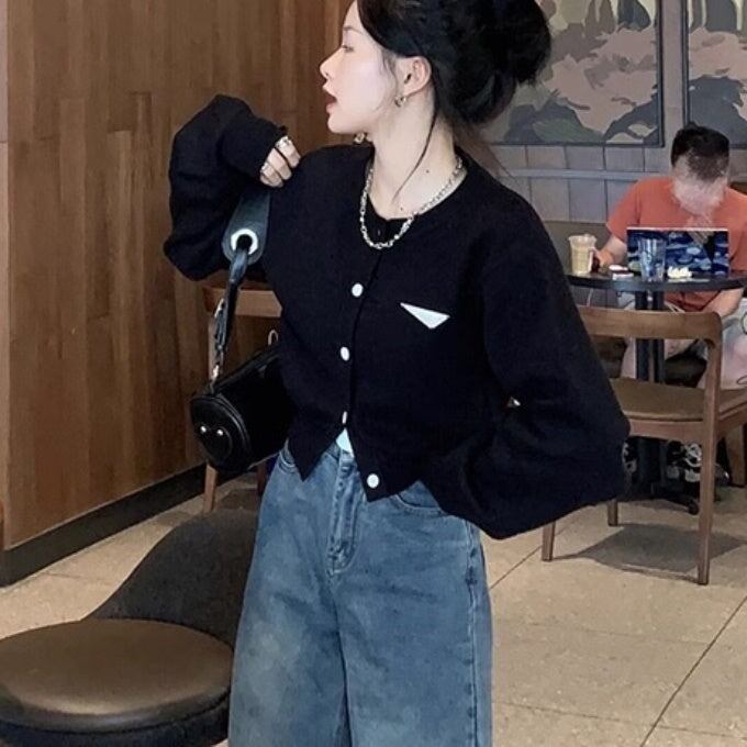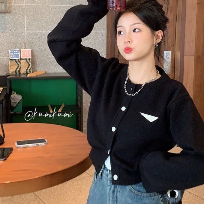 クロップカーディガン レディース 韓国 ファッション 黒ニット ロング袖 ボリューム袖 バイカラー モノトーン かわいい ガーリー おしゃれ