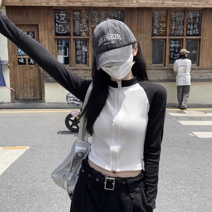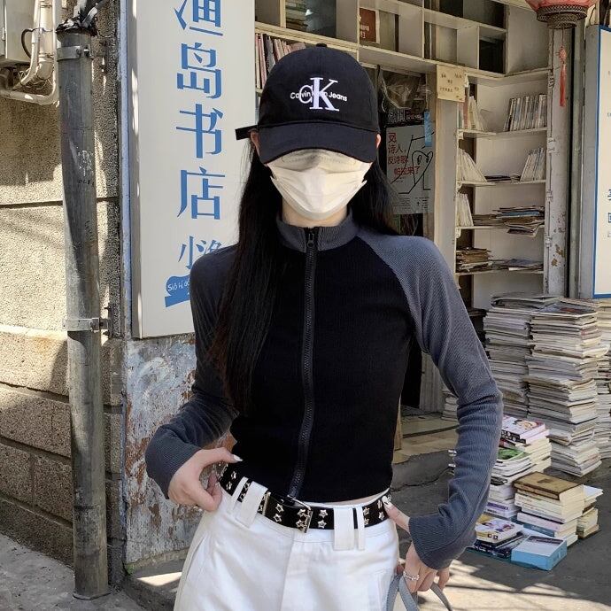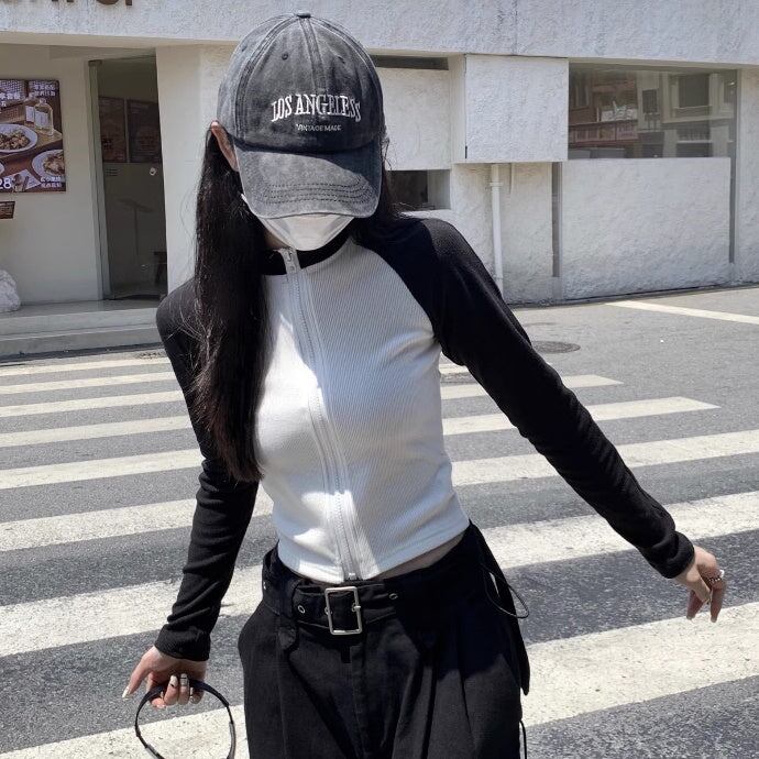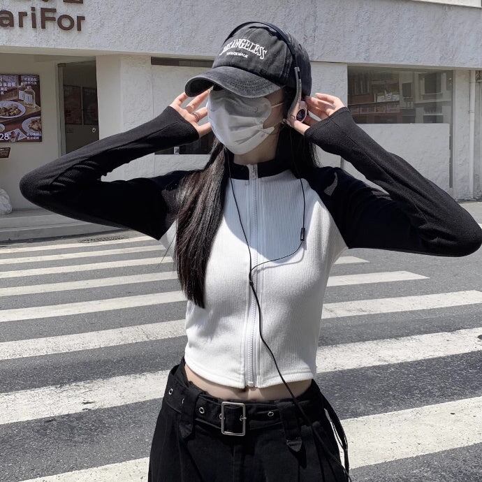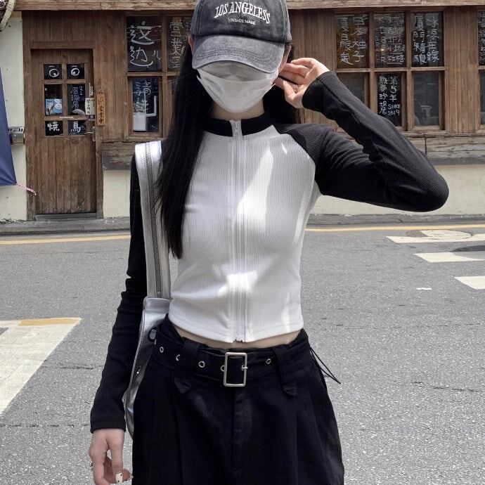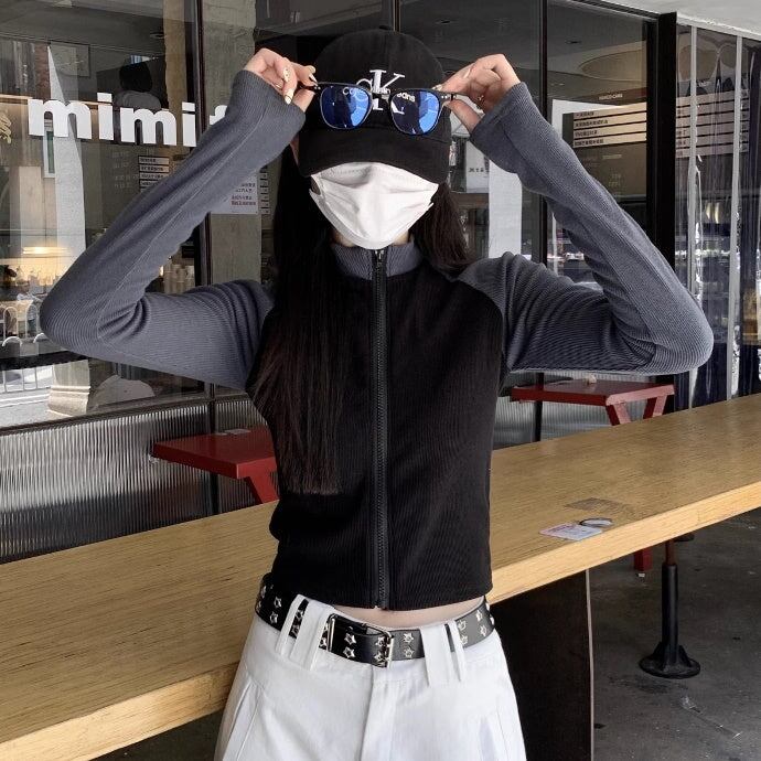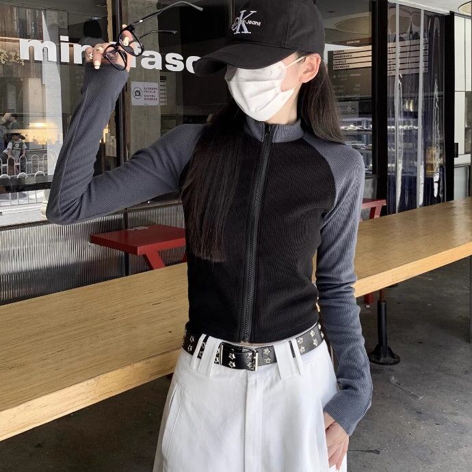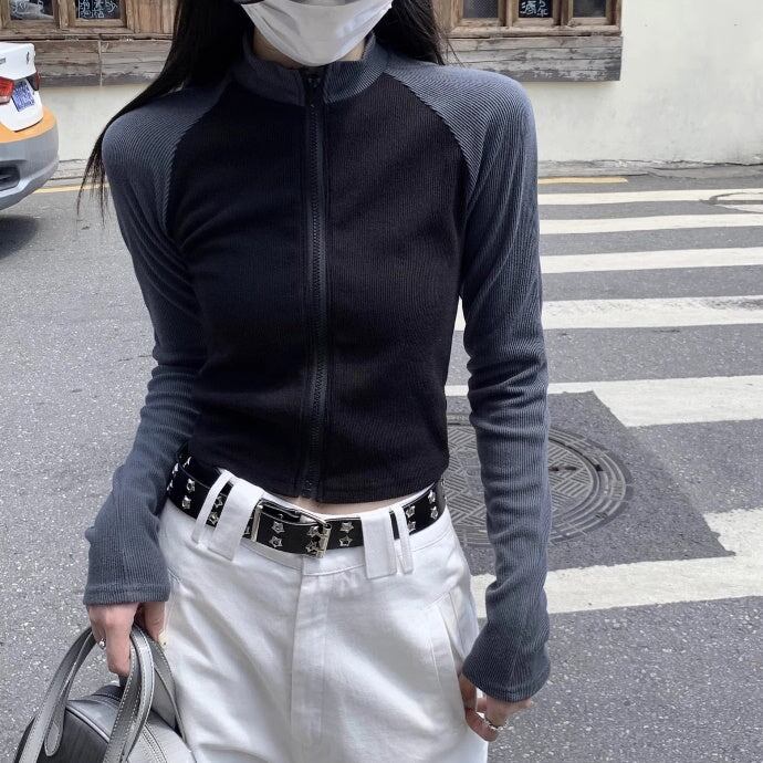 ジップブルゾン レディース 韓国 ファッション バイカラー タイトトップス クロップトップス ジップカーディガン スリム タイトフィット ミニマム ショートT
