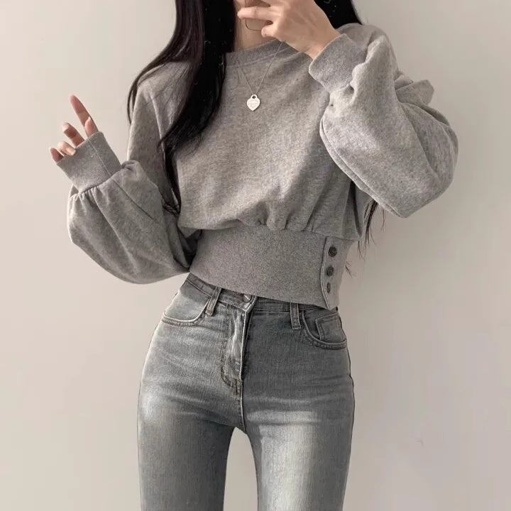 クロップド スウェット レディース 韓国 ファッション ボリュームスリーブ ウエストシェイプ ショート トレーナー 秋冬トップ