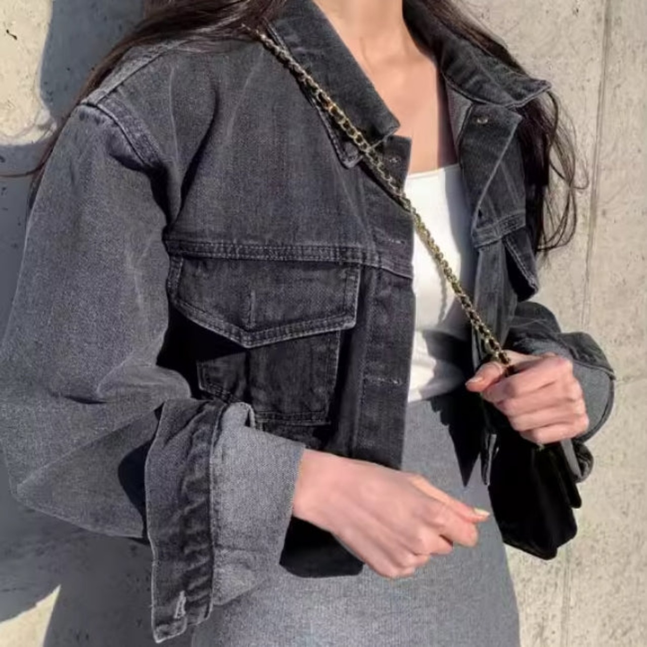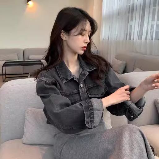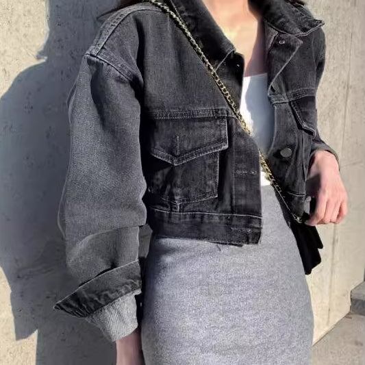 クロップド デニムジャケット レディース 韓国 ファッション ショート丈 Gジャン ブラック ブルー denim