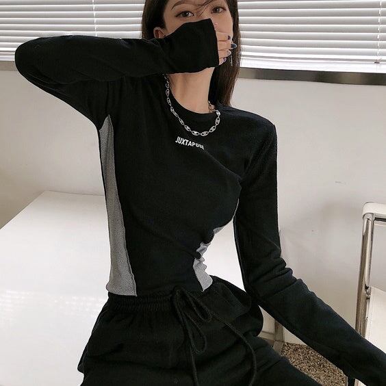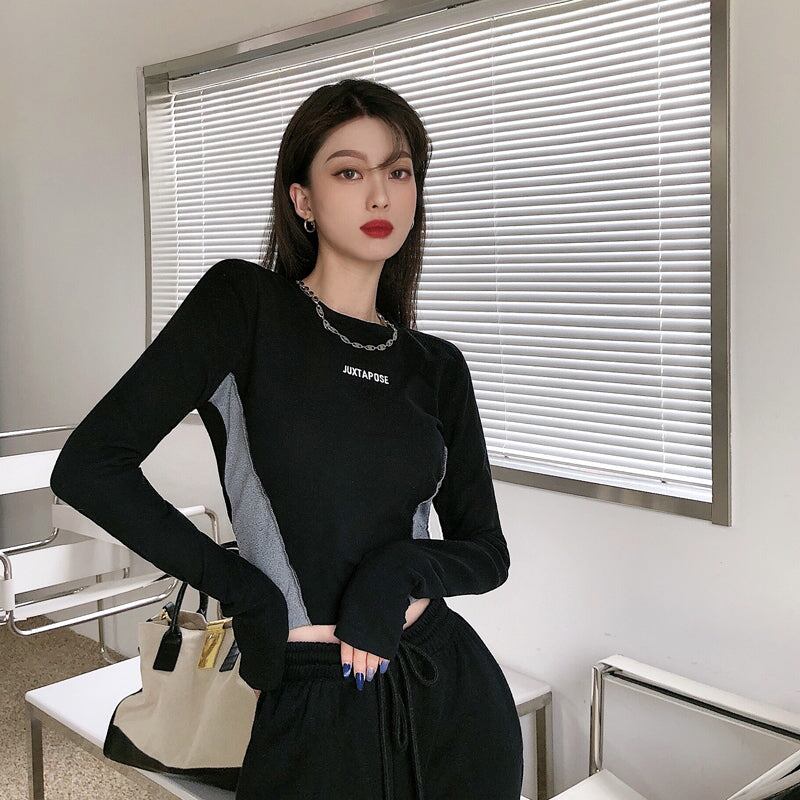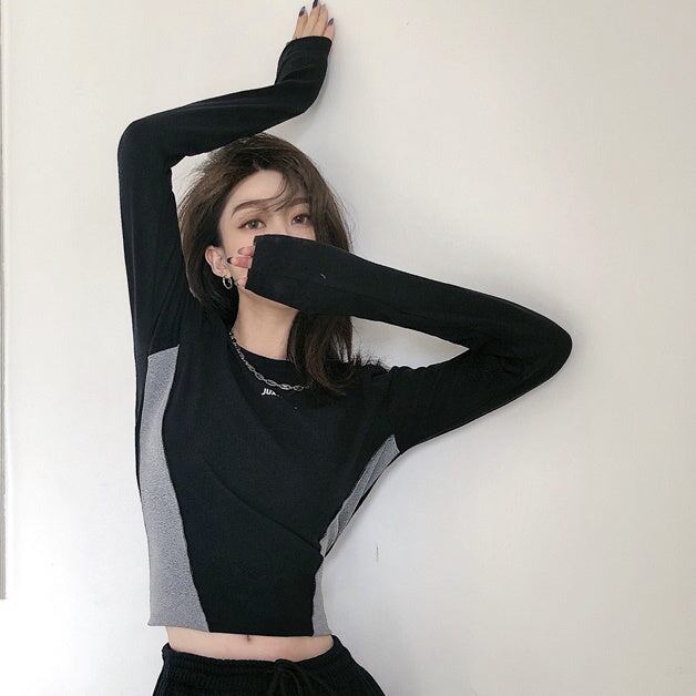 クロップド トップス レディース バイカラー ストレッチ カットソー 韓国 ファッション スポカジ ロンT 春