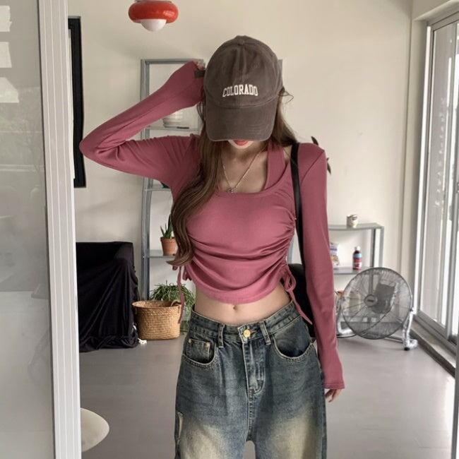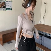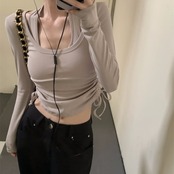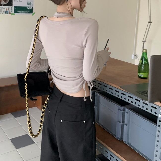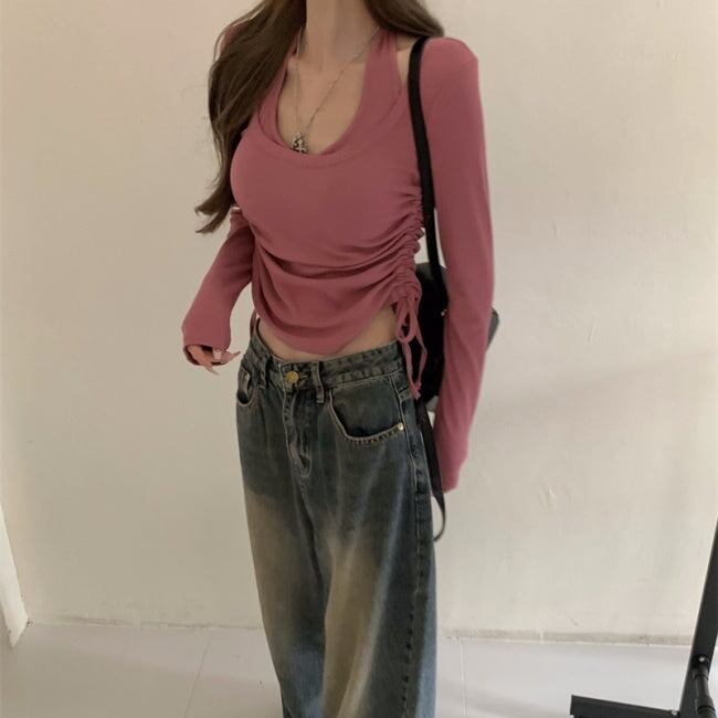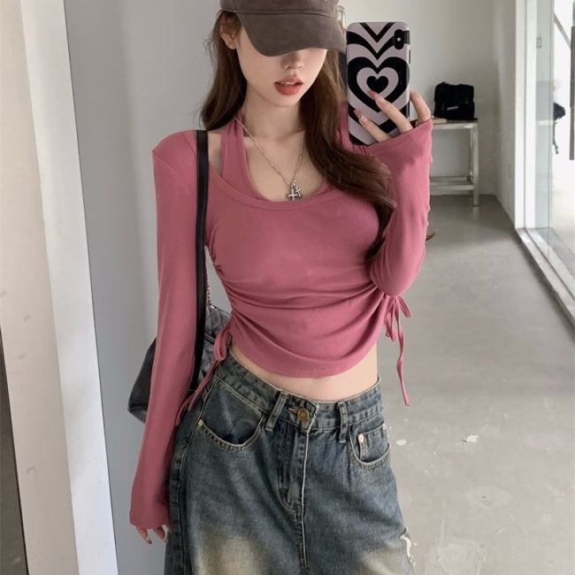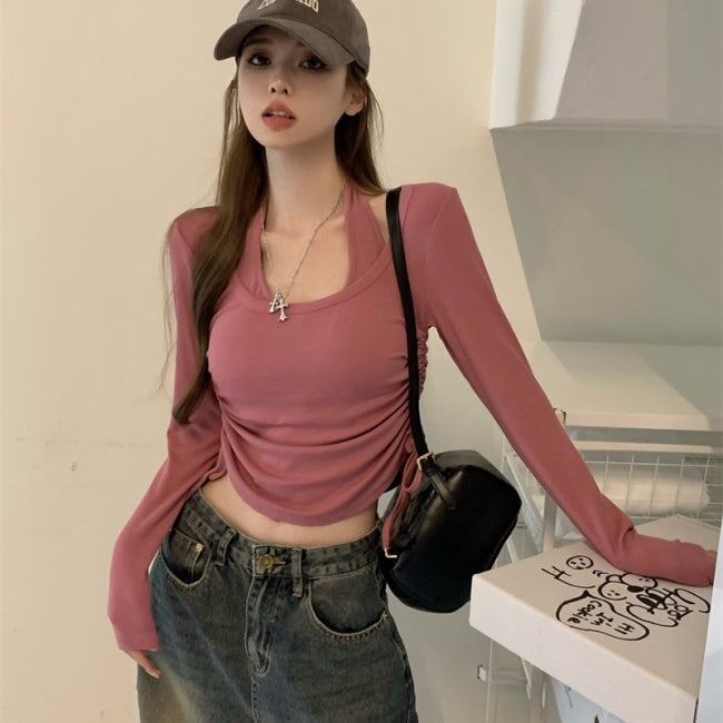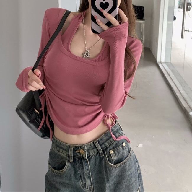 クロップド カットソー フェイクレイヤード レディース 韓国 ファッション 無地 ホルターネック トップス 長袖 シャーリング ショート丈