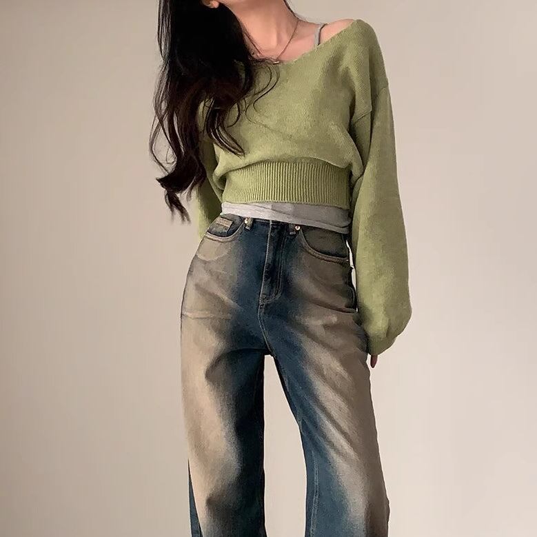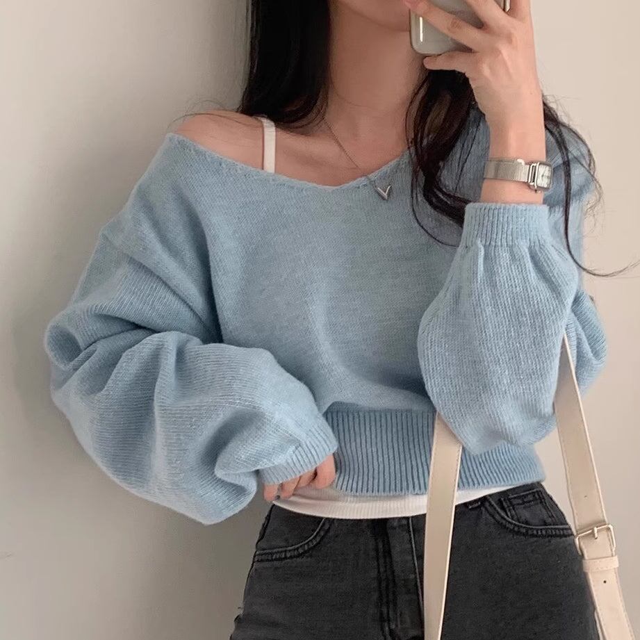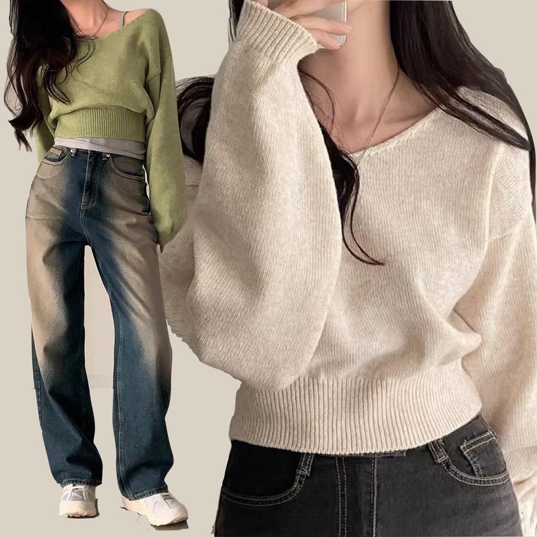クロップド ニット レディース 韓国 トップス 冬 ショート丈 Vネック セーター