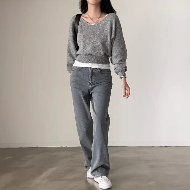 広めのVネックでデコルテをきれいにみせる