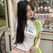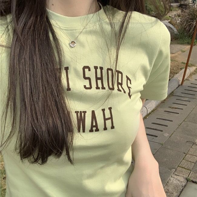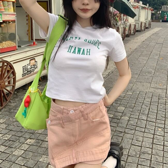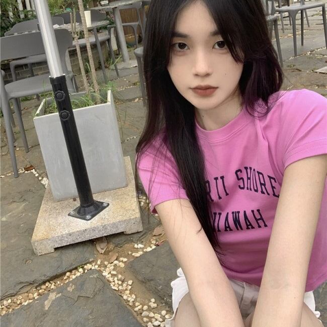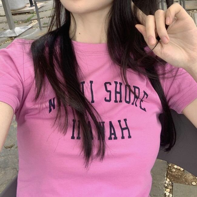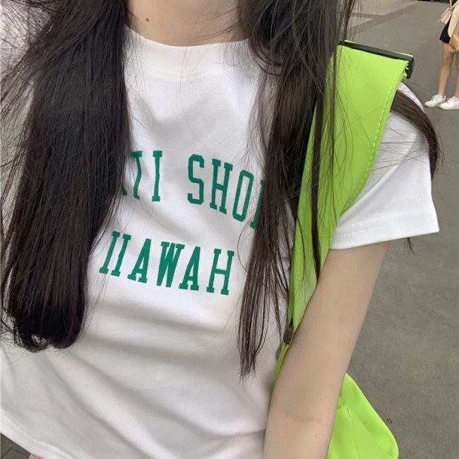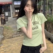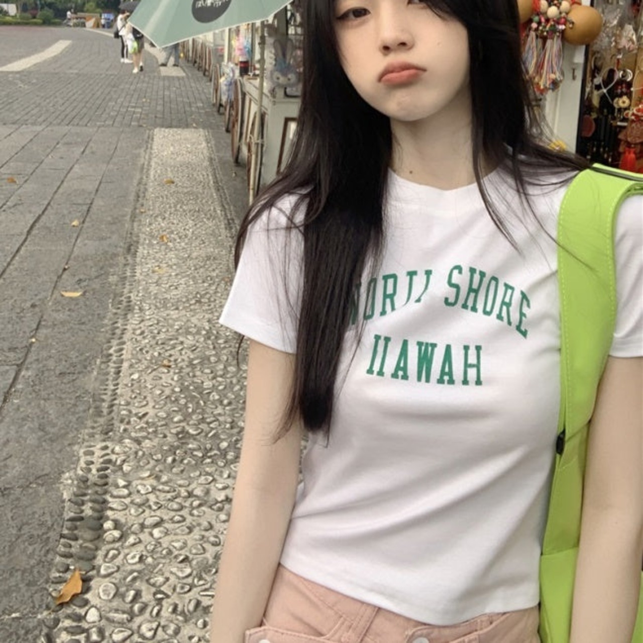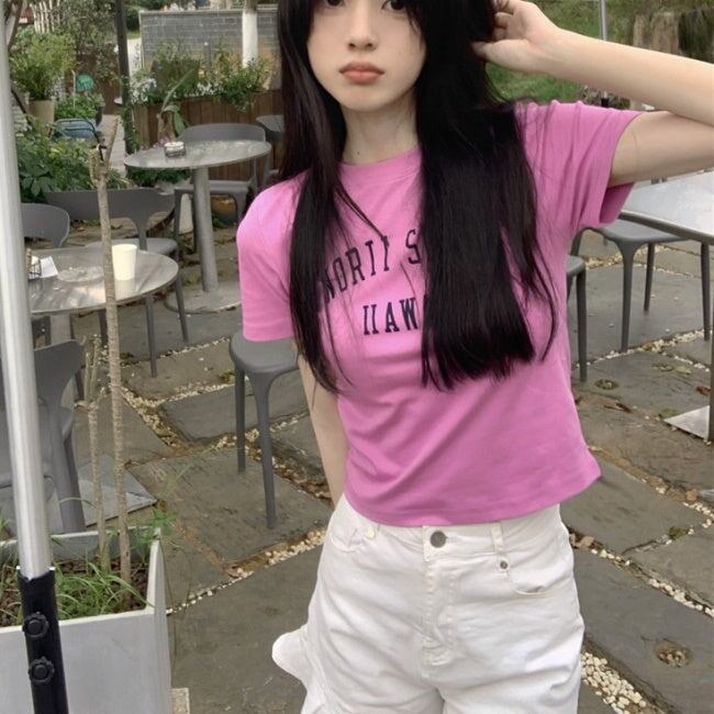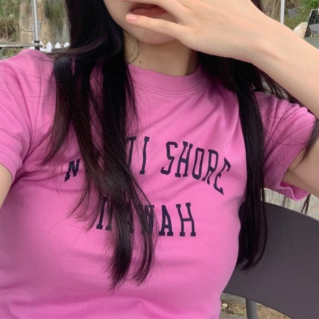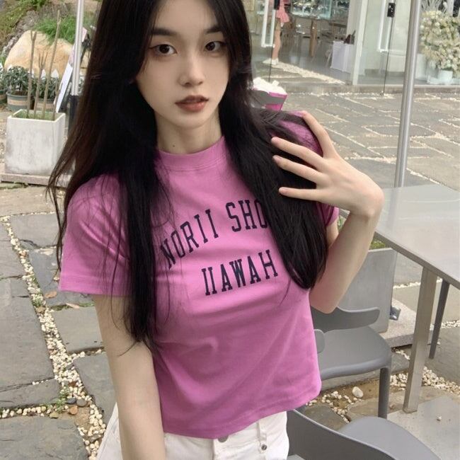 Tシャツ クロップド丈 レディース 韓国 ファッション ロゴ タイト トップス 夏服 半袖 タイトTシャツ