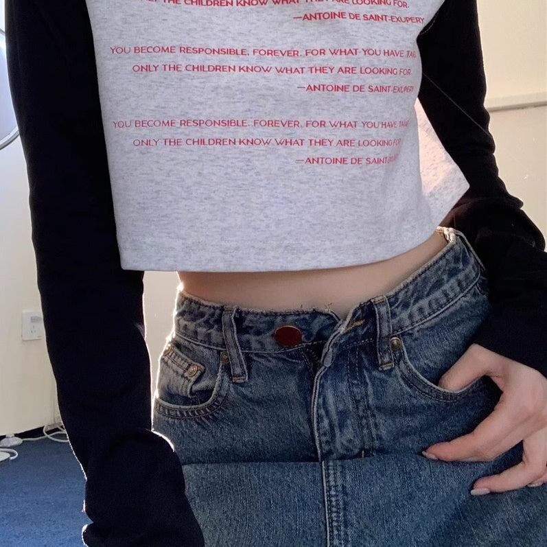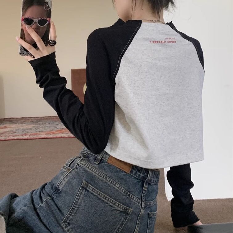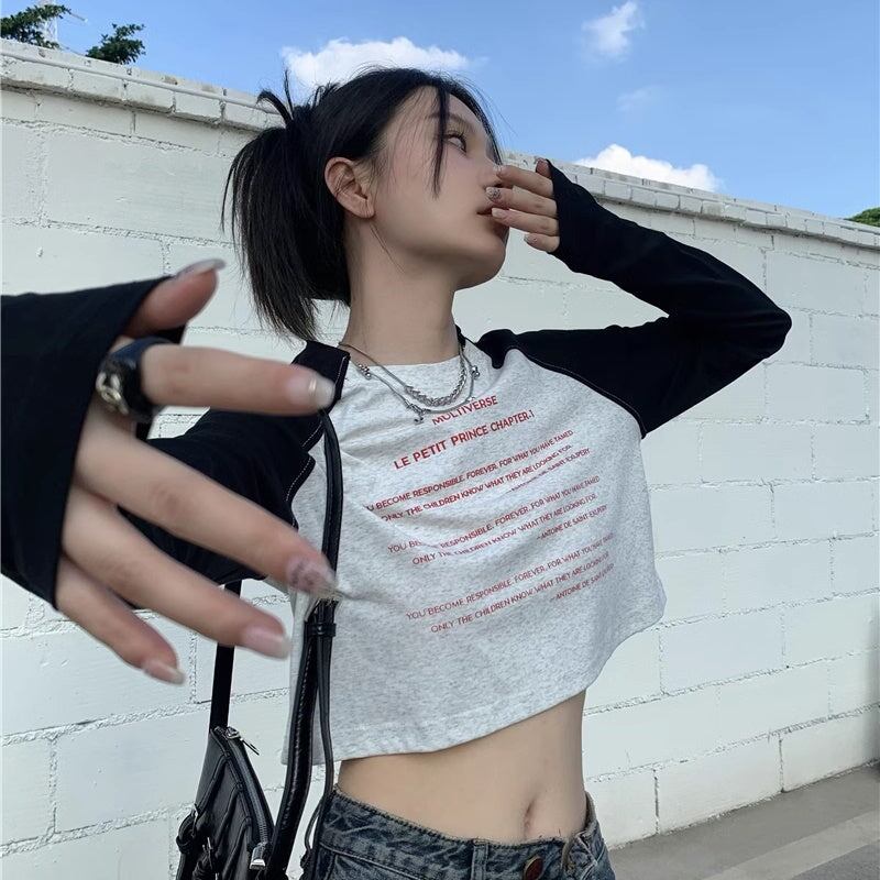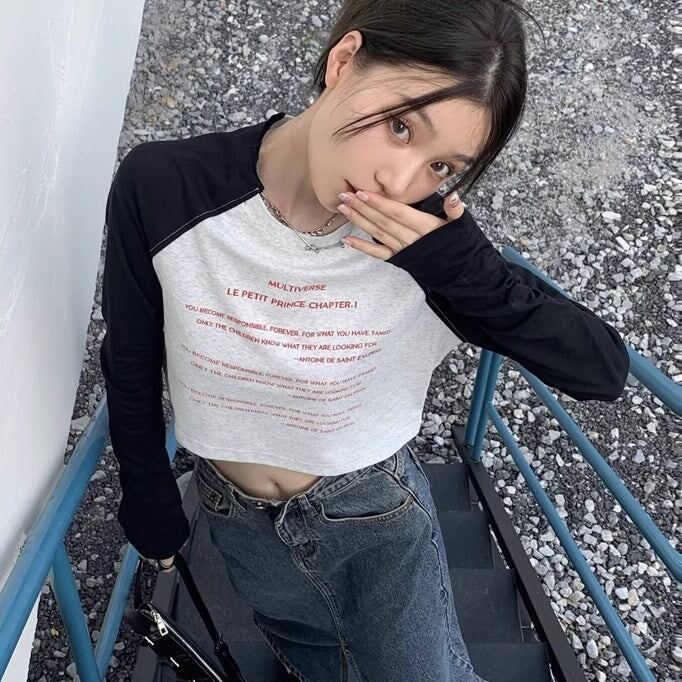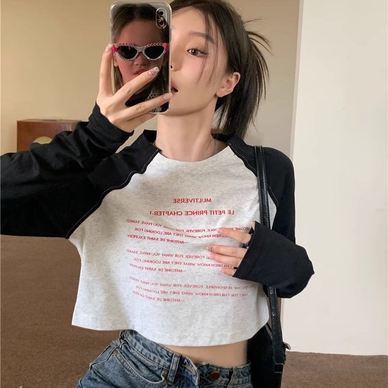 長袖 Tシャツ レディース 韓国 ファッション ロゴT ロング袖 メッセージ バイカラー コントラスト ラグラン袖 クロップ タイト ミニ T