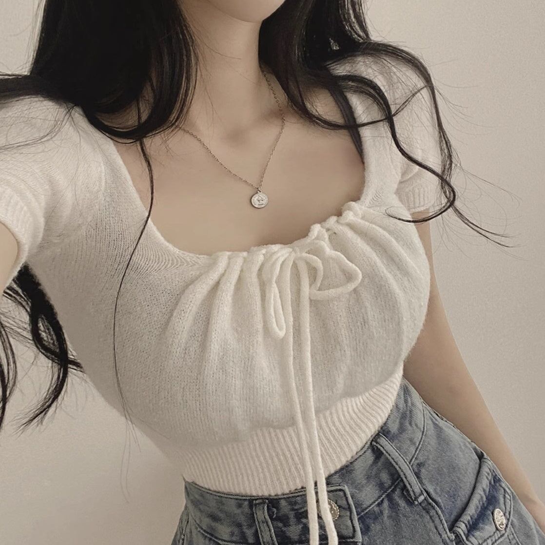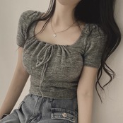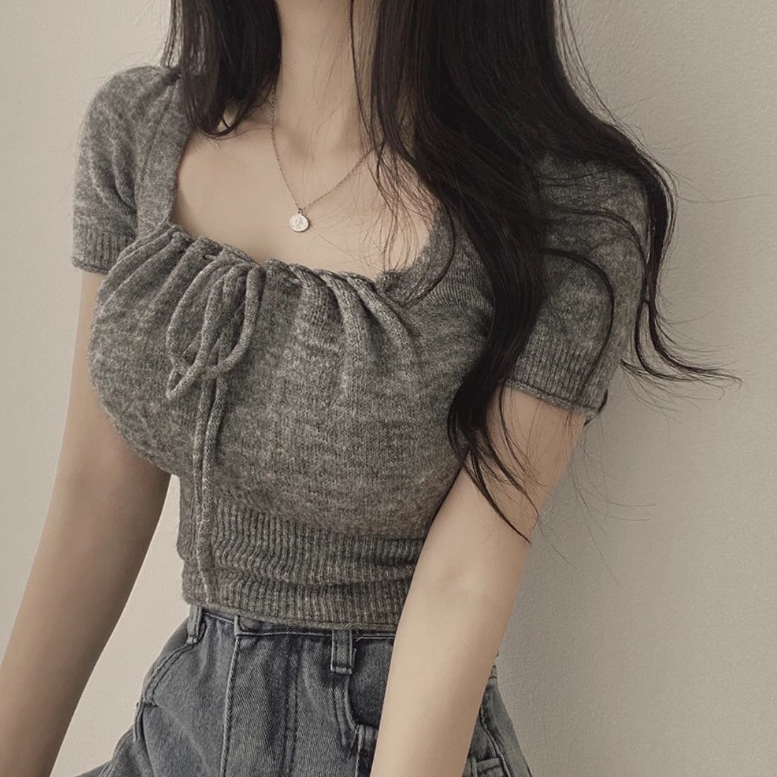 クロップニット 半袖 トップス レディース 韓国 ファッション リボン スクエアネック タイト ニットT ショート丈 タイト