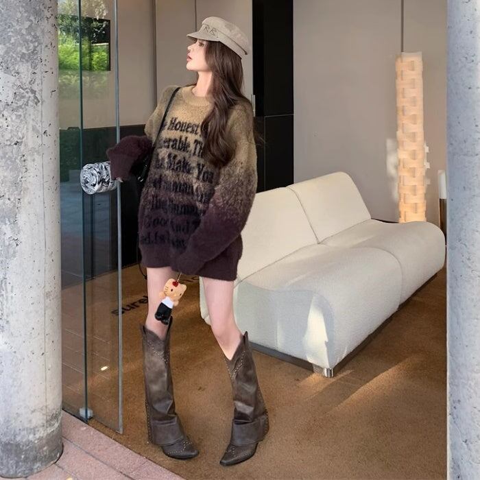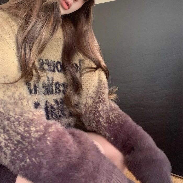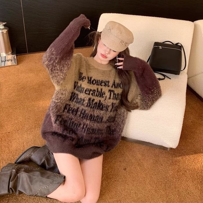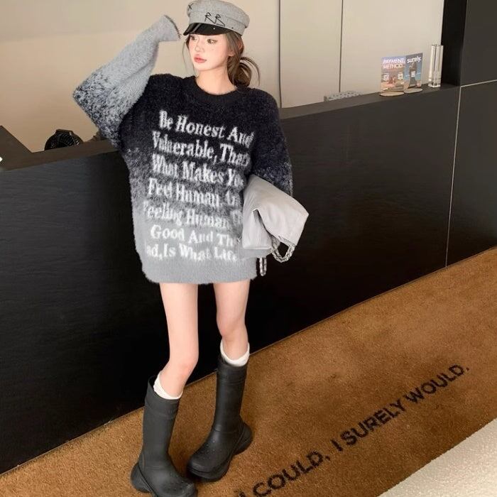 グラデーション シャギー ニット セーター レディース 韓国 ファッション メッセージ ロゴ オーバーサイズ 冬トップス