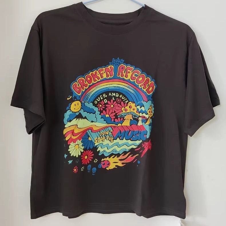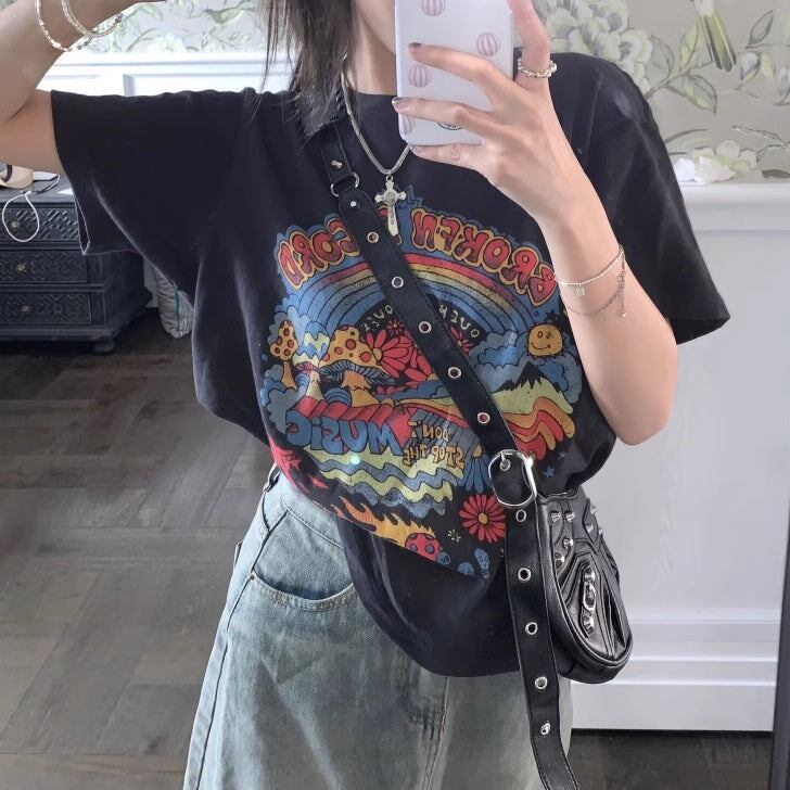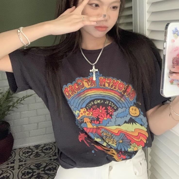 Tシャツ サイケ プリント レディース 韓国 ファッション 派手 かわいい ワイドシルエット キノコ マッシュルーム レインボー