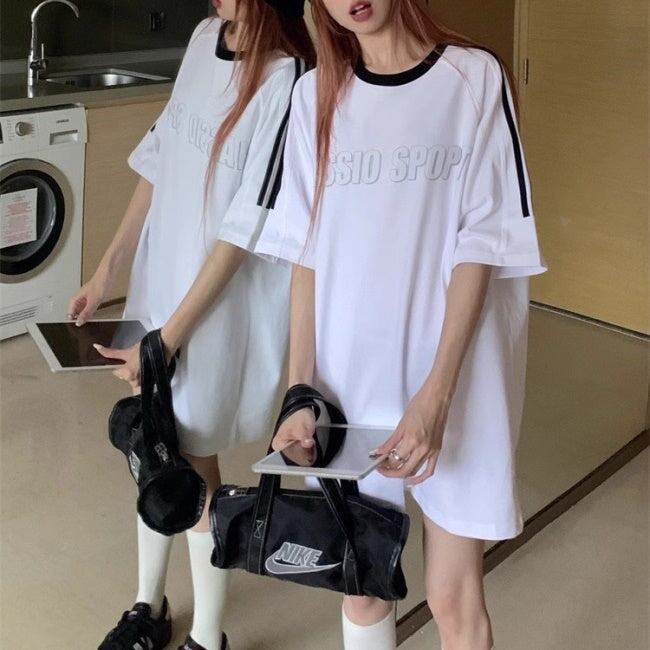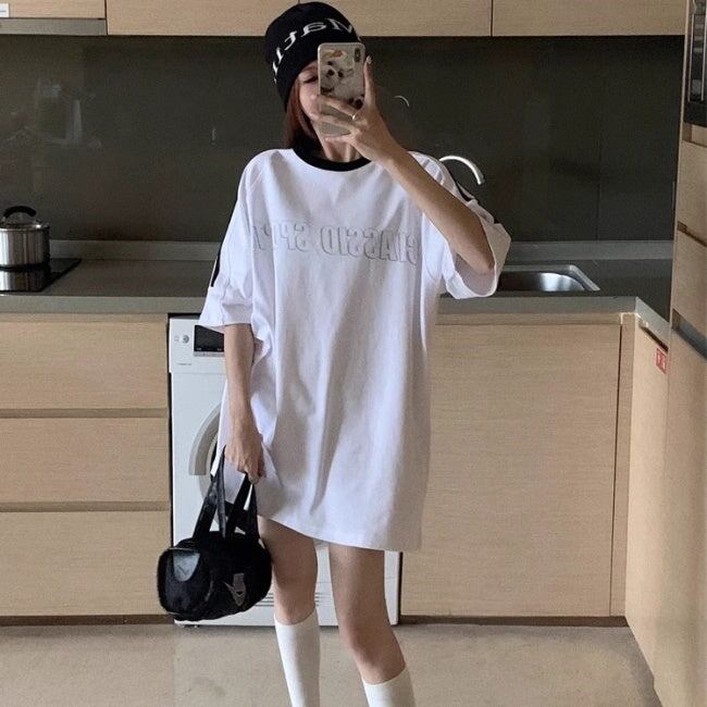 グラフィック ライン リンガーTシャツ レディース 韓国 ファッション モノトーン 白Tシャツ ロング丈 オーバーサイズ ビッグT