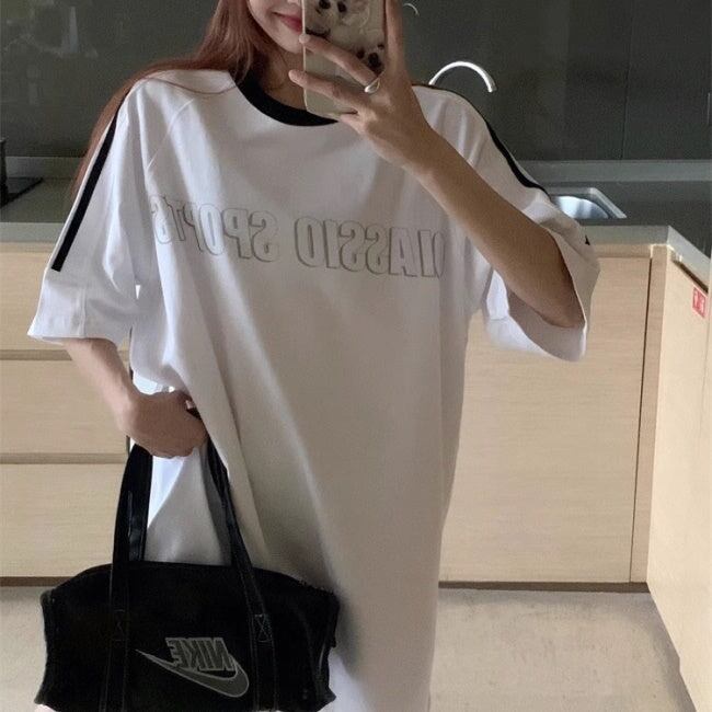 リンガーTシャツ サイドライン レディース 韓国 ファッション モノトーン 白Tシャツ ロング丈 オーバーサイズ ビッグT ビッグシルエット