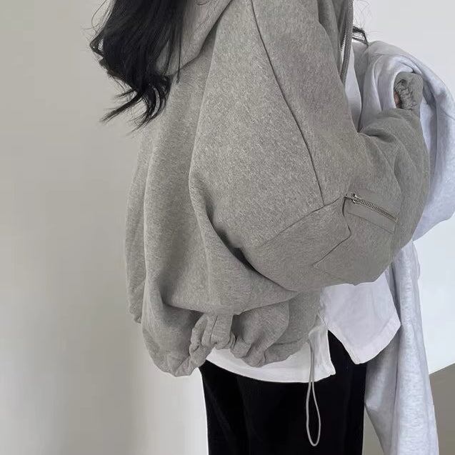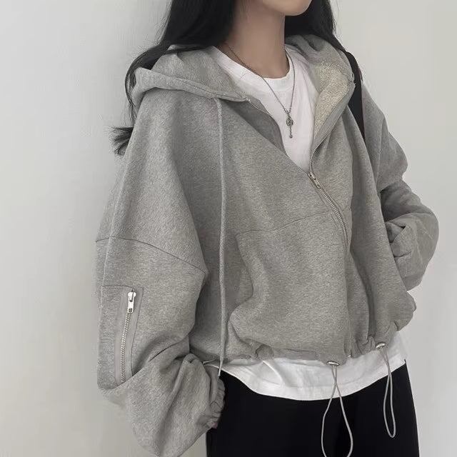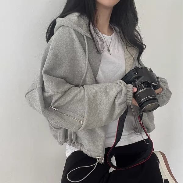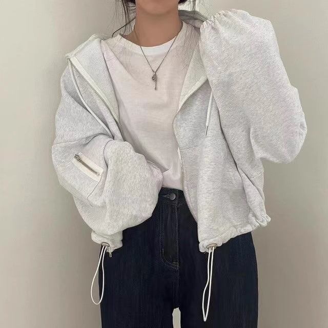 グレー ジップ パーカー レディース 韓国 ファッション スウェット フーディー 袖ジップ ウエスト調整 ドローコード