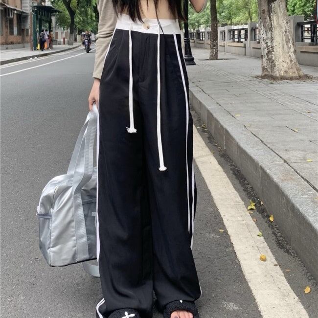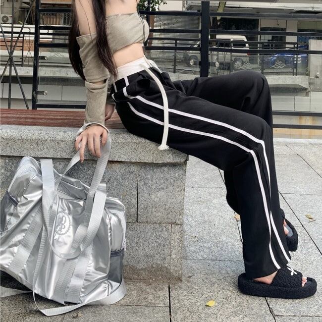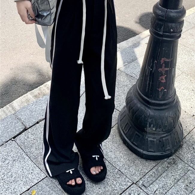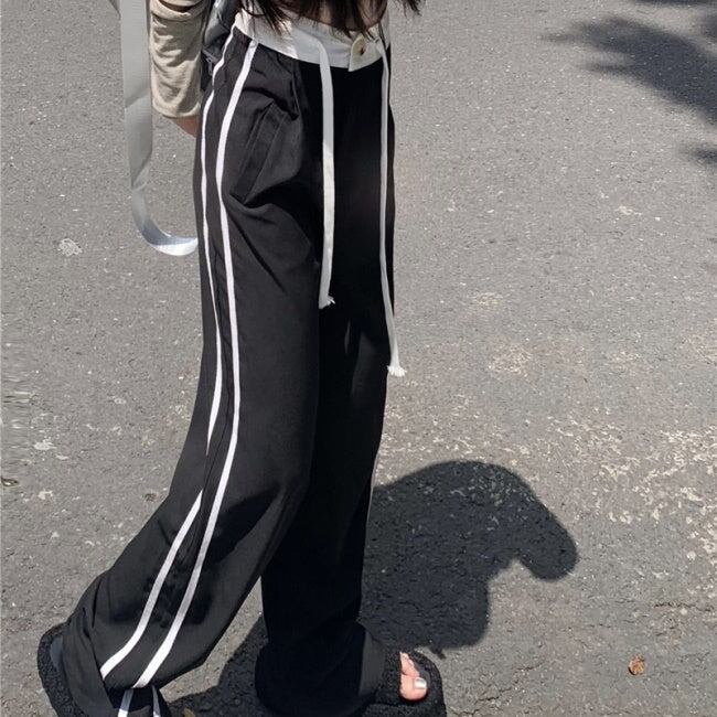 ラインパンツ レディース 韓国 ファッション ウエストゴム 黒パンツ ワイドシルエット オーバーサイズ ゆったりパンツ ジャージパンツ スポーツ