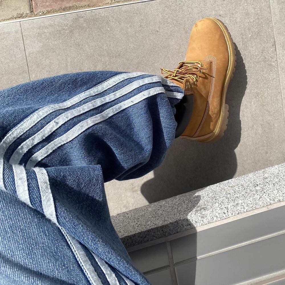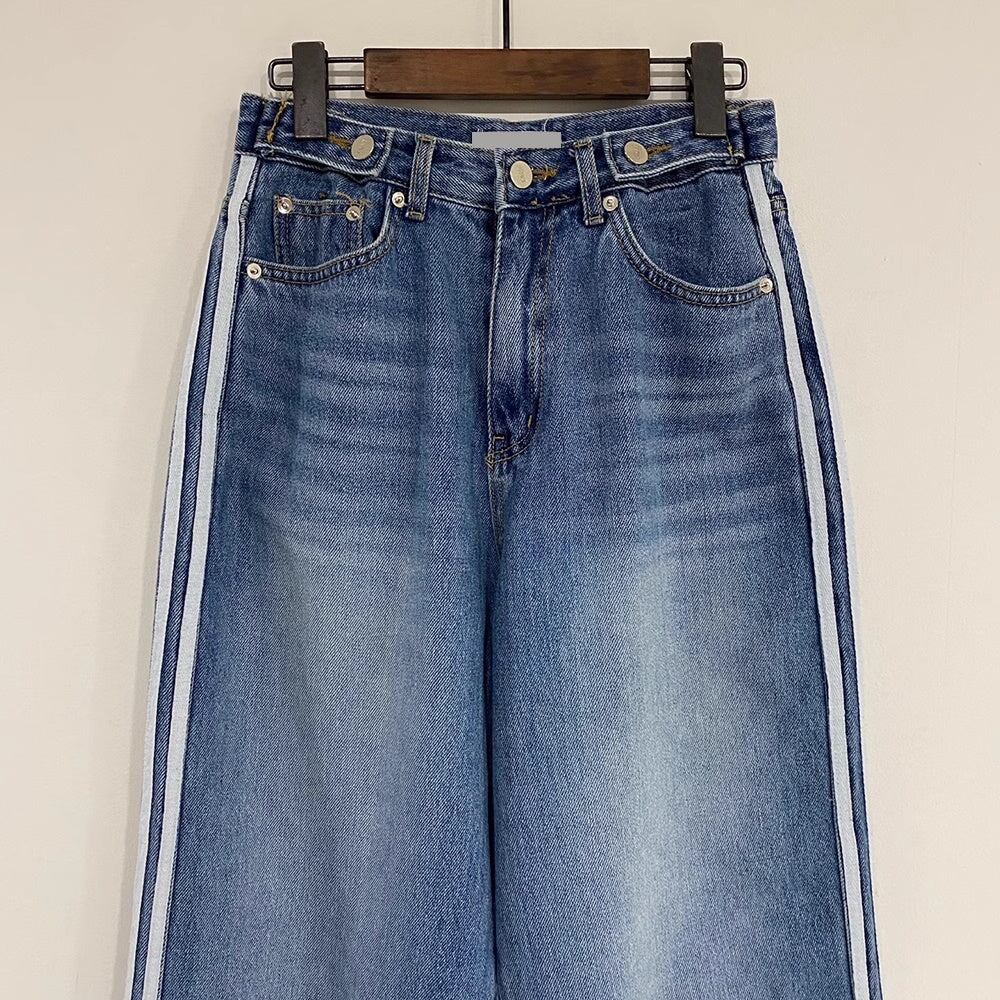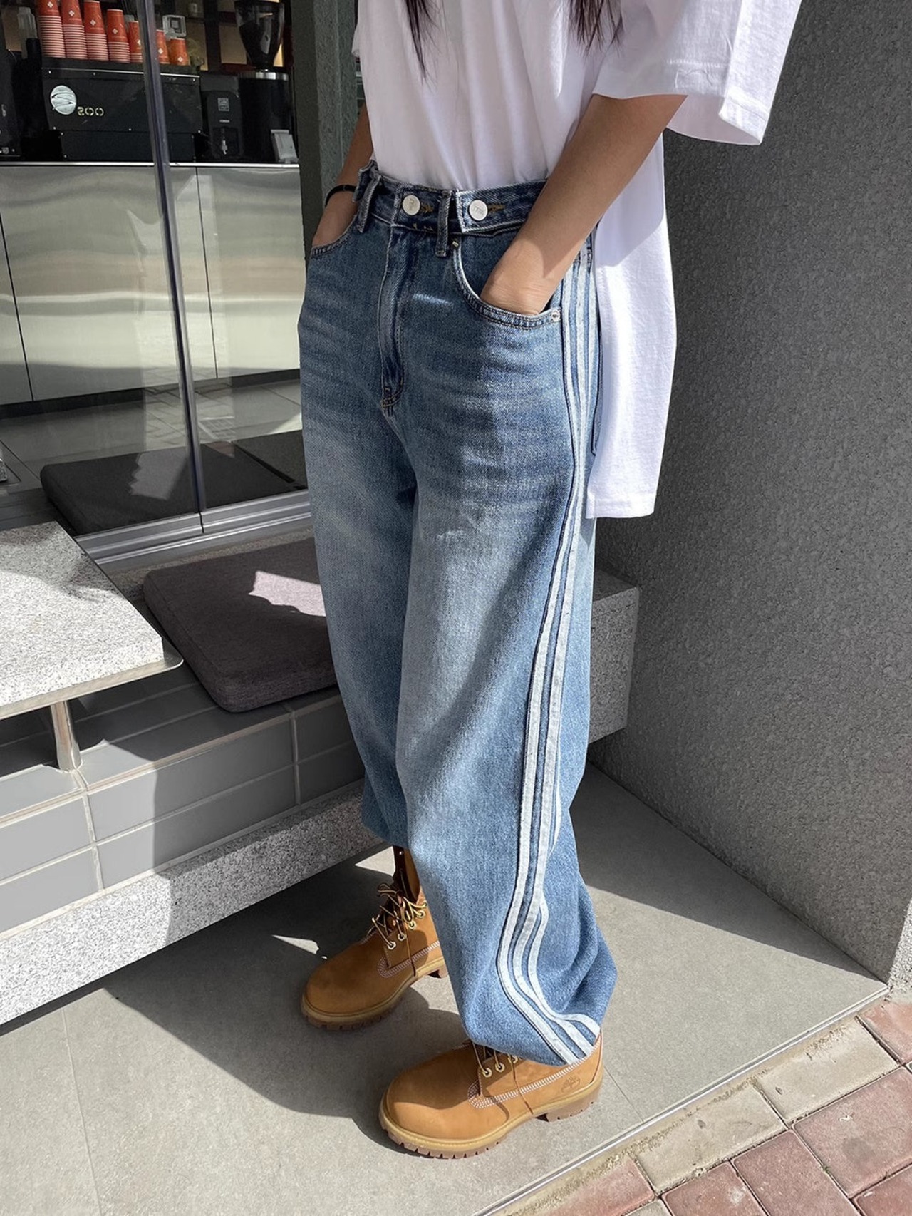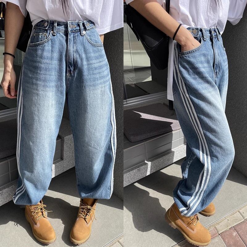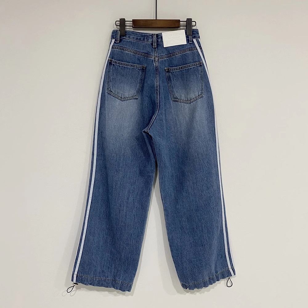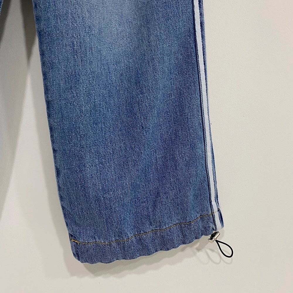 サイドライン デニムパンツ レディース 韓国 ファッション 裾ゴム スポーツミックス デニム ワイドパンツ