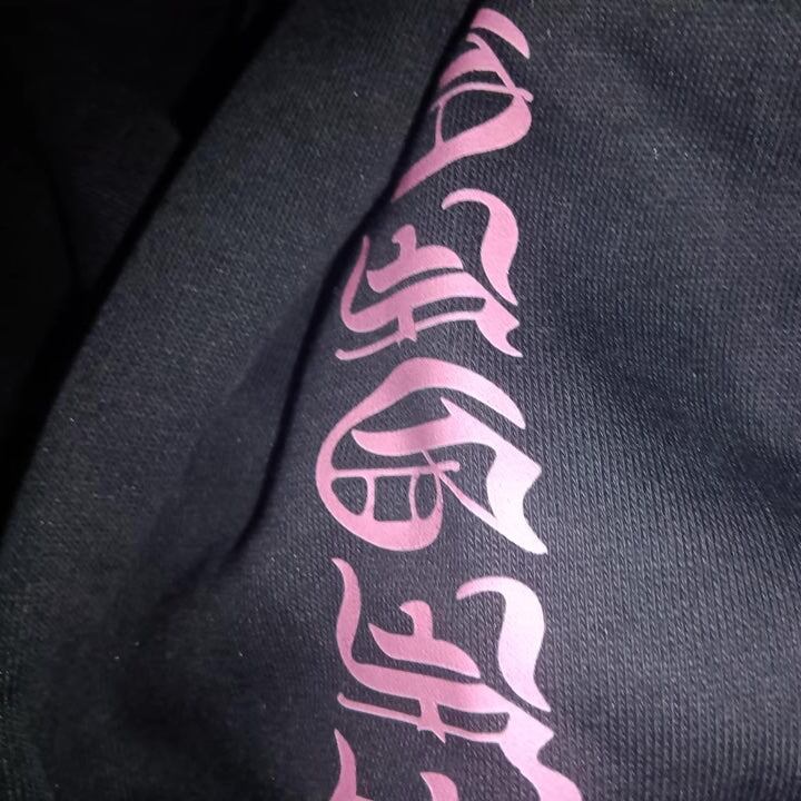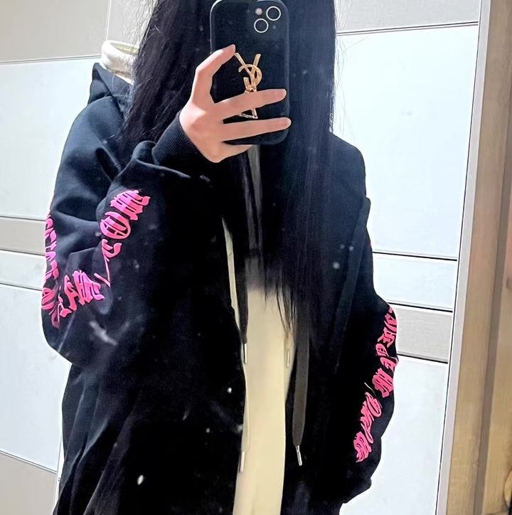 ベンチコート ロングパーカー レディース 韓国 ファッション 裏起毛 サンスクリット ロゴ 袖プリント 黒アウター 防寒アウター