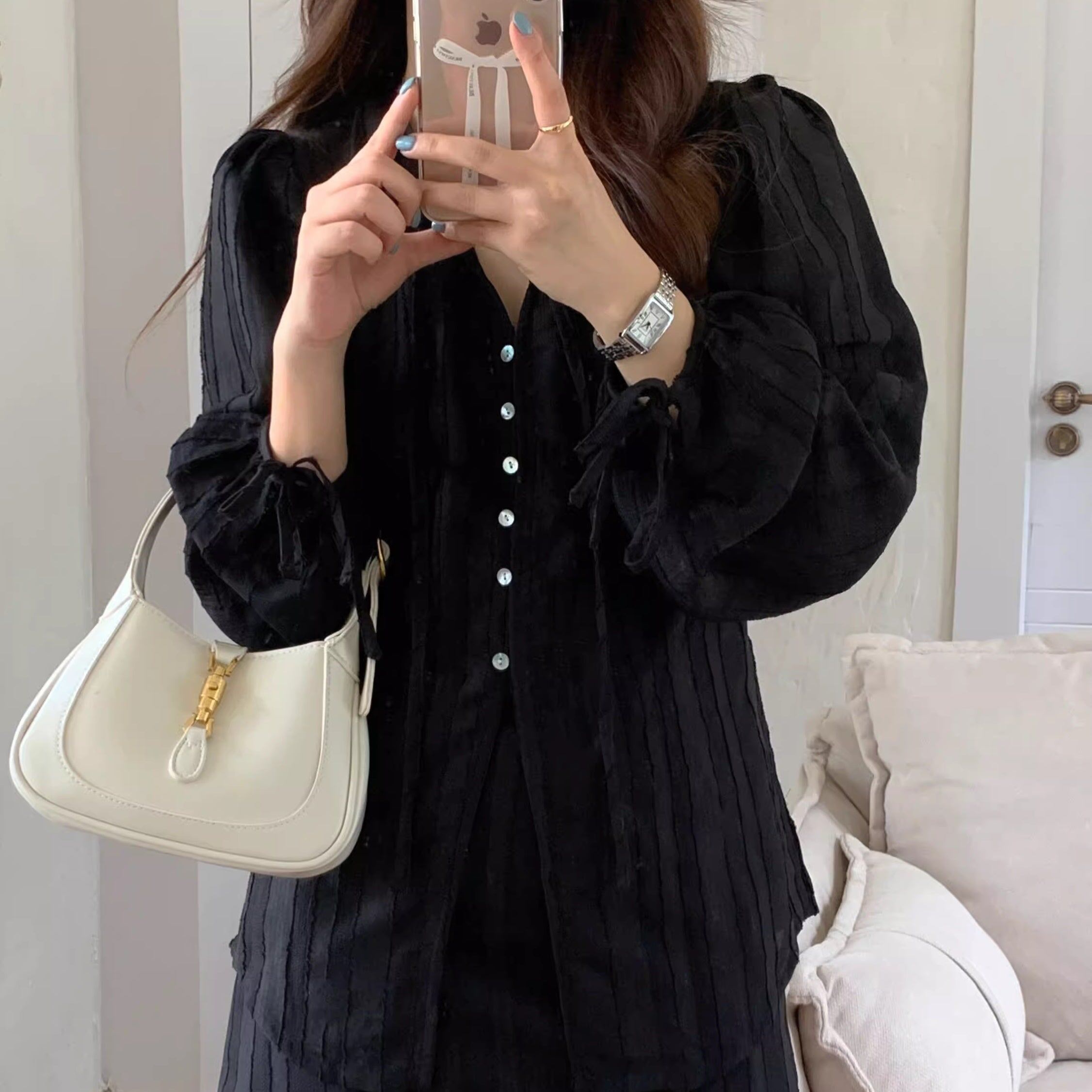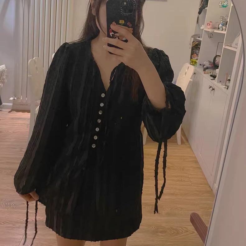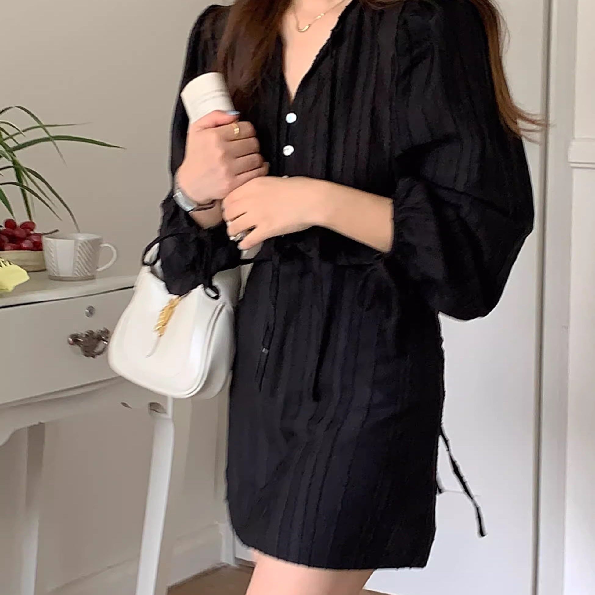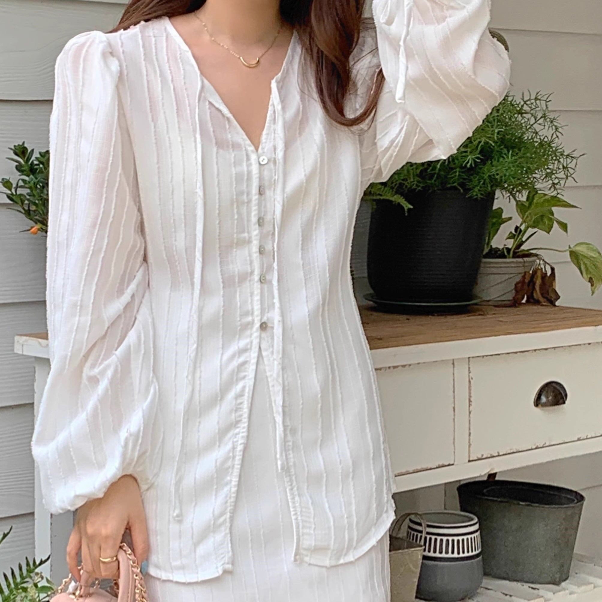 ワンピース Vネック レディース 韓国 ファッション ボリュームスリーブ シアーシャツ スカート ノーカラ— お呼ばれ