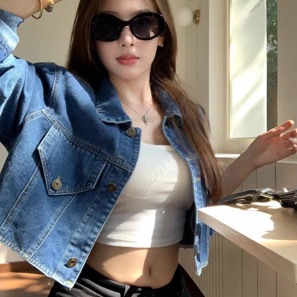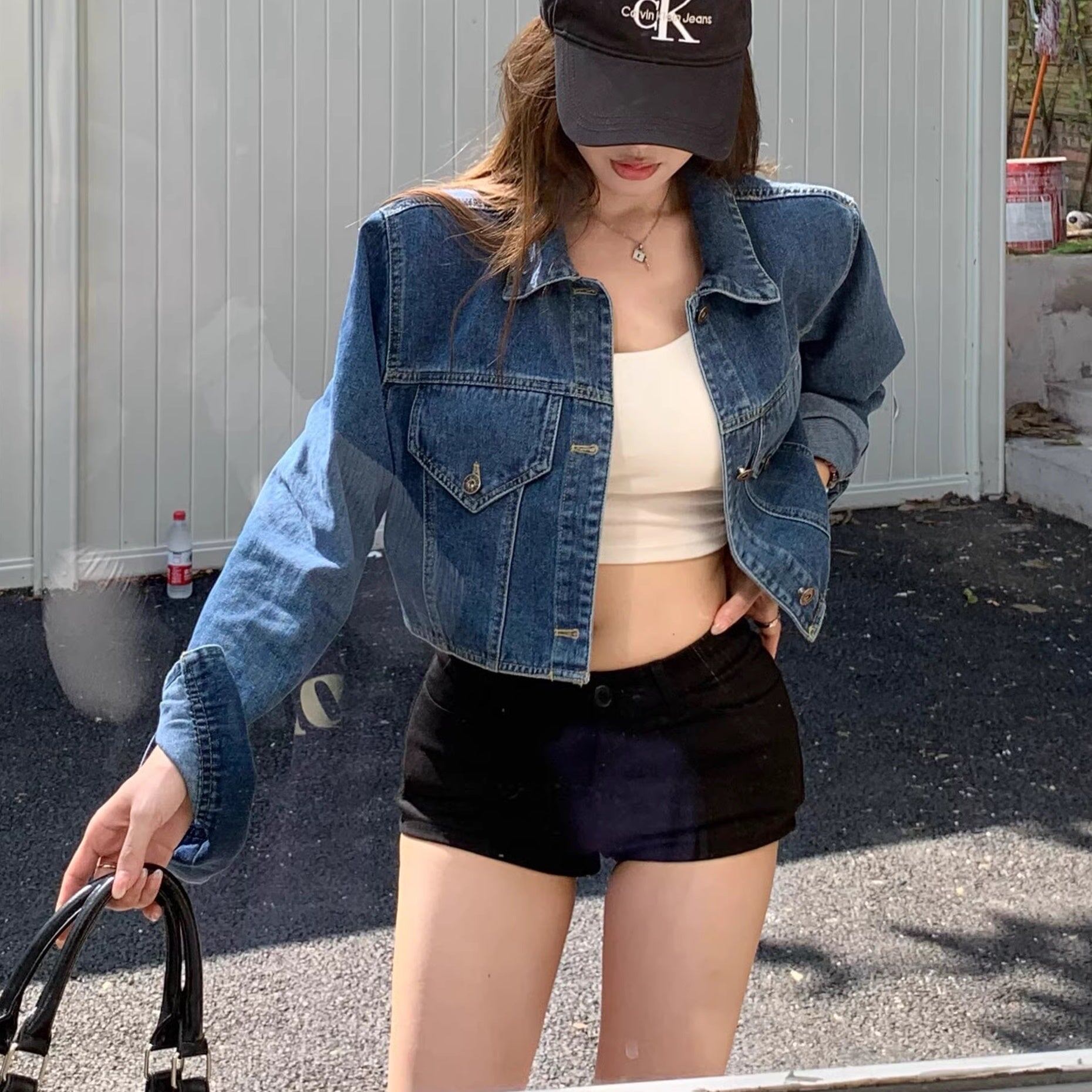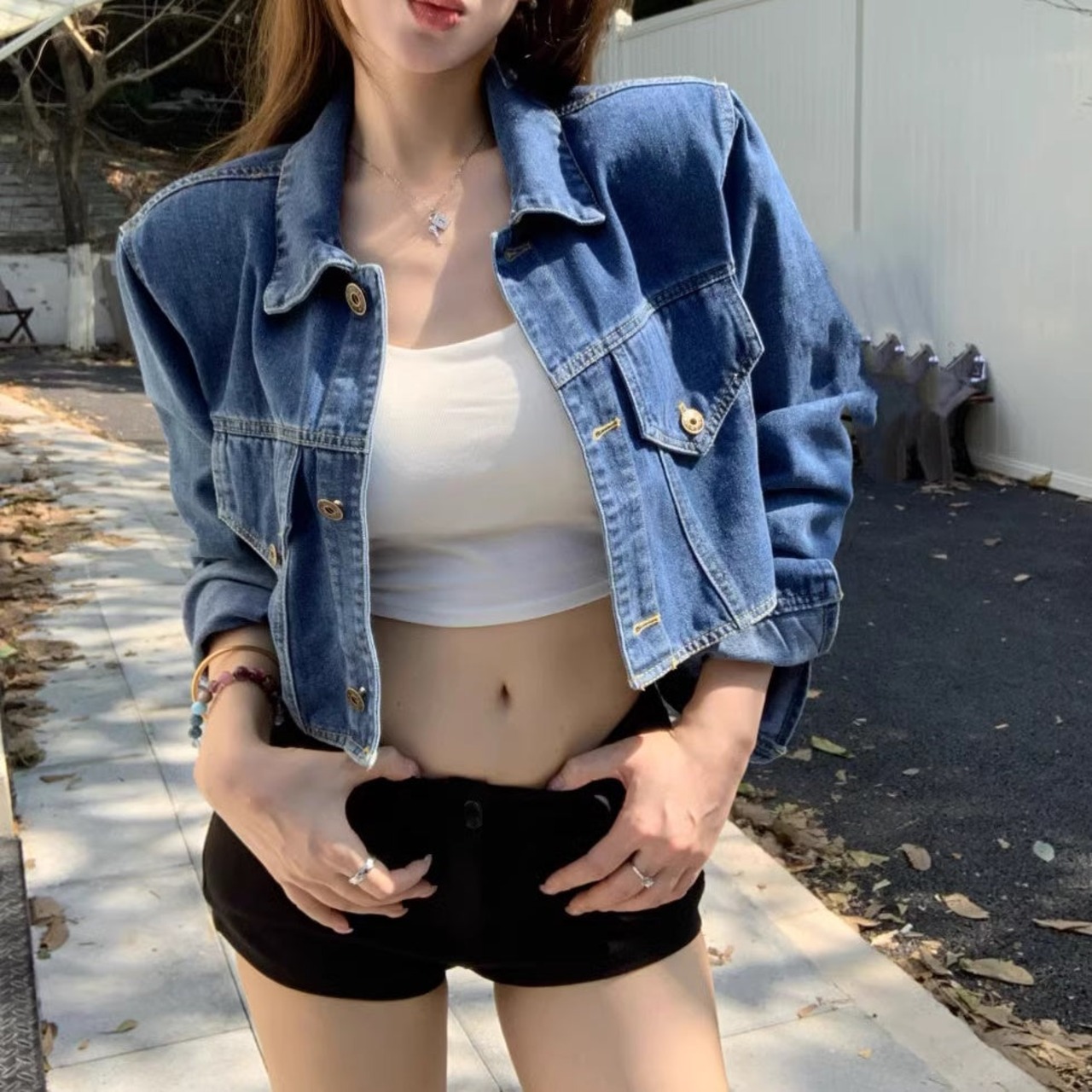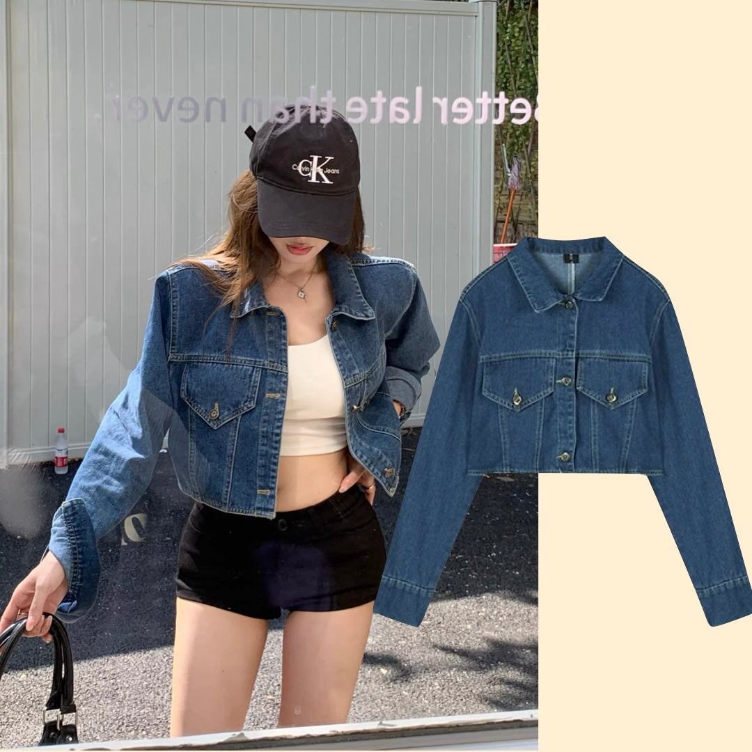 デニムジャケット レディース 韓国 ファッション 薄手 クロップ丈 ブルーデニム 肩パット カジュアル アウター 春秋 アウター デニムブルゾン