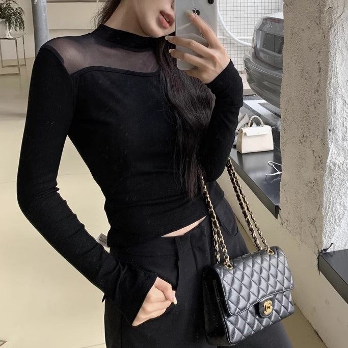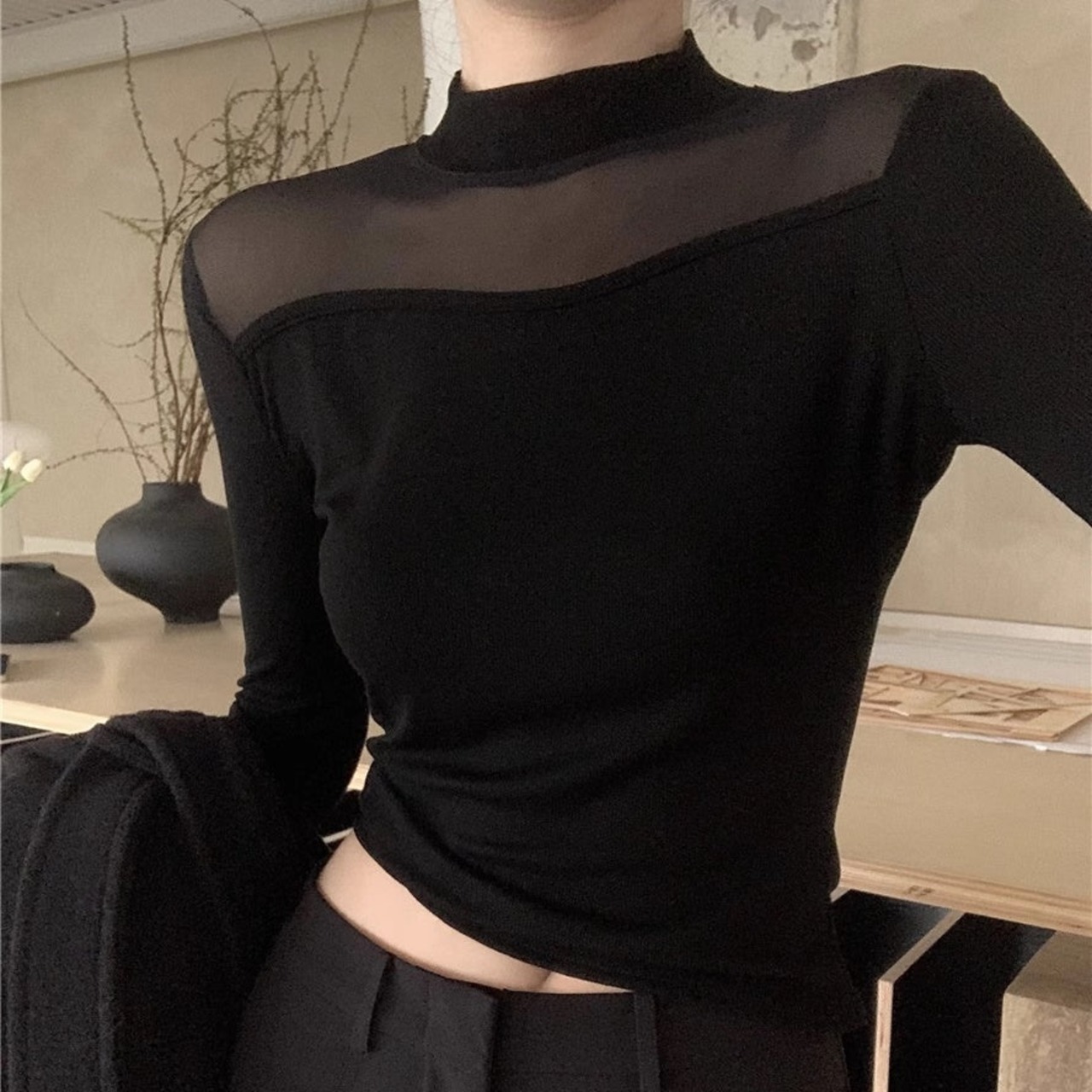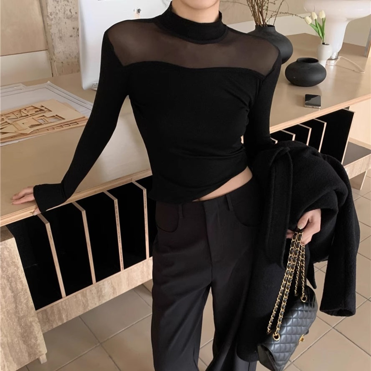 シースルーカットソー レディース 韓国 ファッション 黒トップス ハイネック スリムタイト 長袖 ブラック モックネック