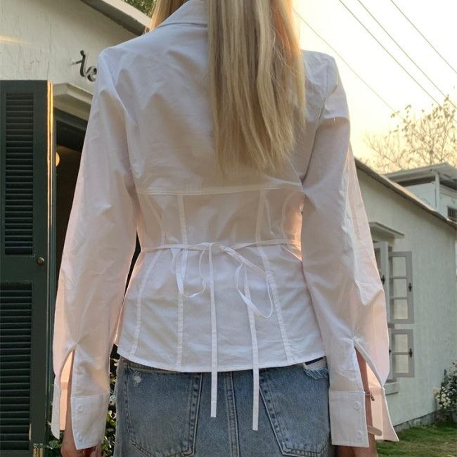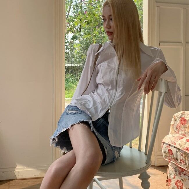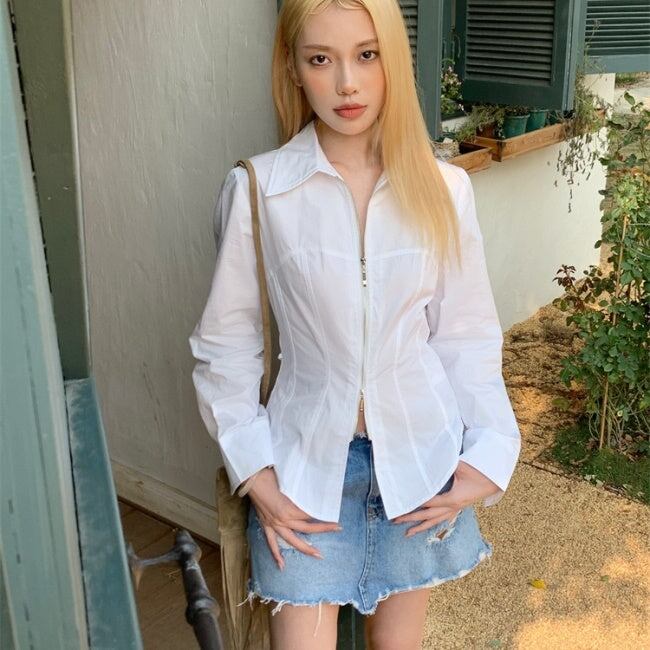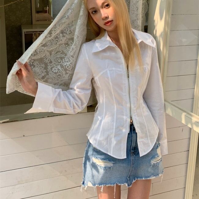 白シャツ ジップ クロップトップ レディース 韓国 ファッション ショートトップス 長袖シャツ ミニマム タイト ウエストシェイプ おしゃれ