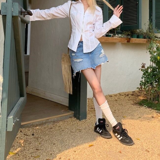 ジップ シャツ レディース 韓国 白シャツ ウエストシェイプ タイト ショート ミニマム シャツ 春夏 トップス