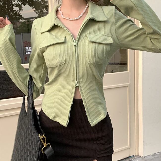 ジップアップ リブニット カットソー レディース 韓国 春 クロップトップ へそみせ ミニマム トップス