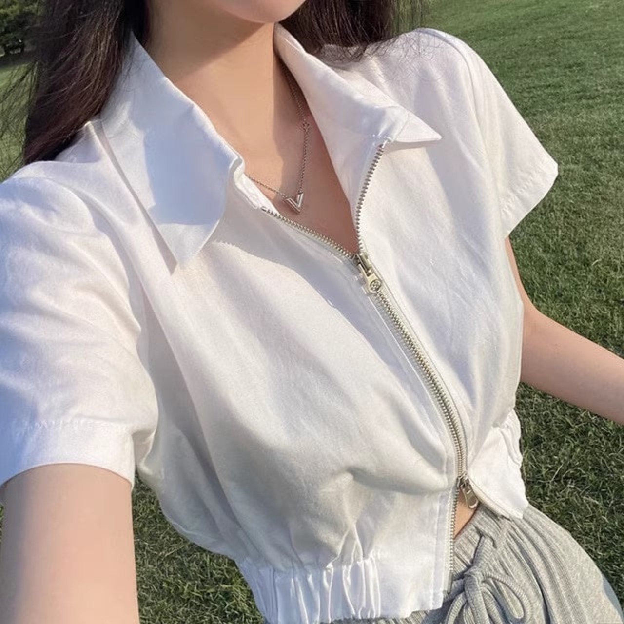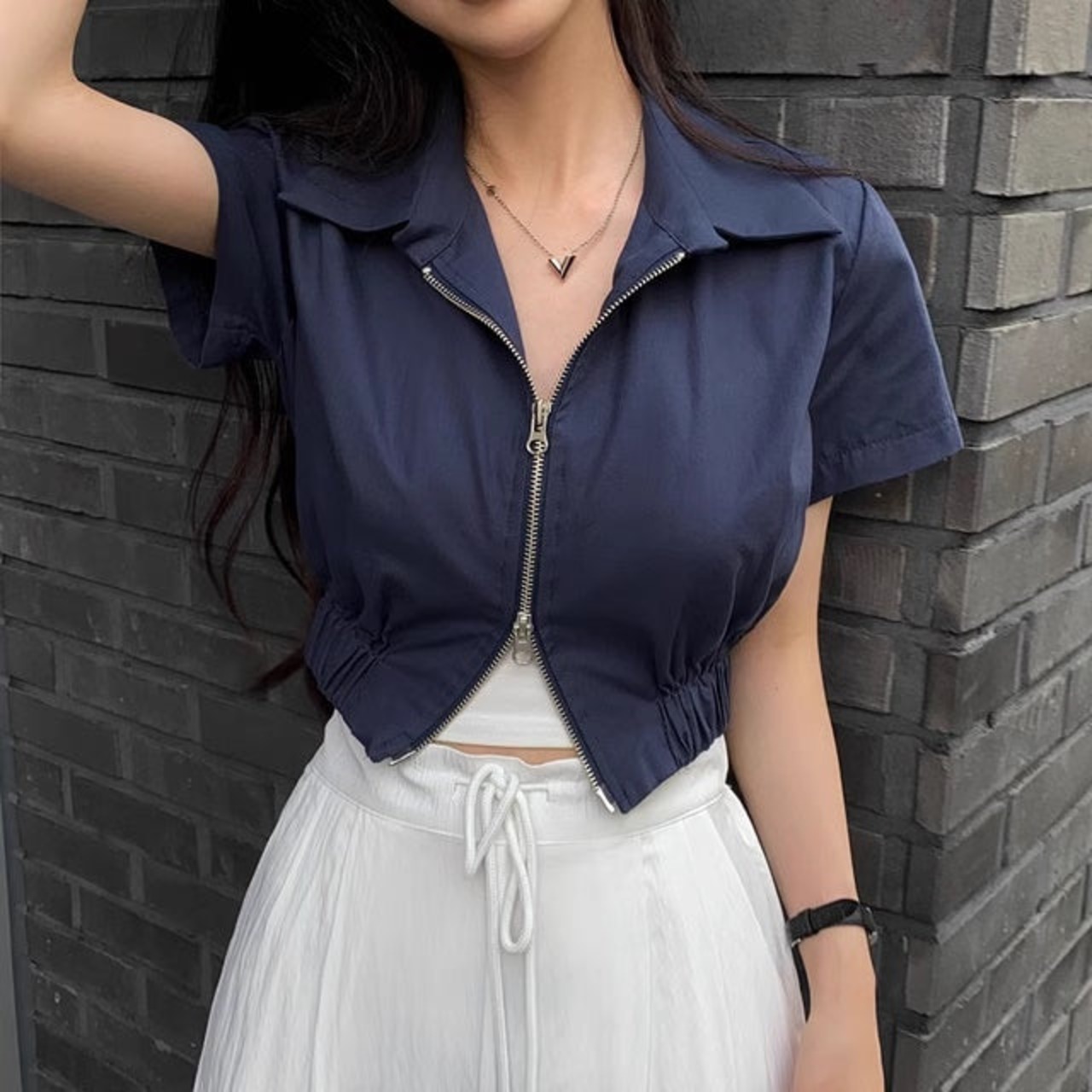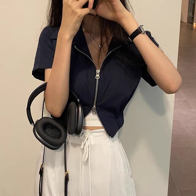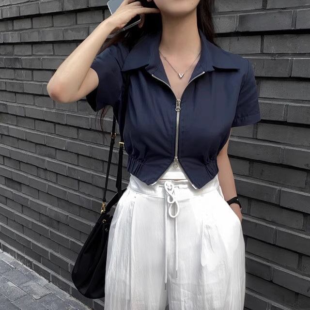 ジップアップ 半袖 ブルゾン トップス 夏 レディース 韓国 ファッション ダブルジップ クロップド丈 スキッパー