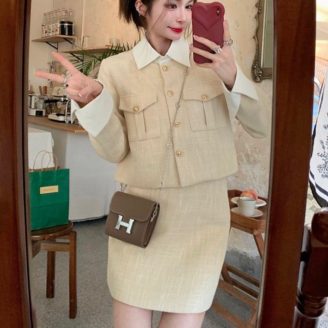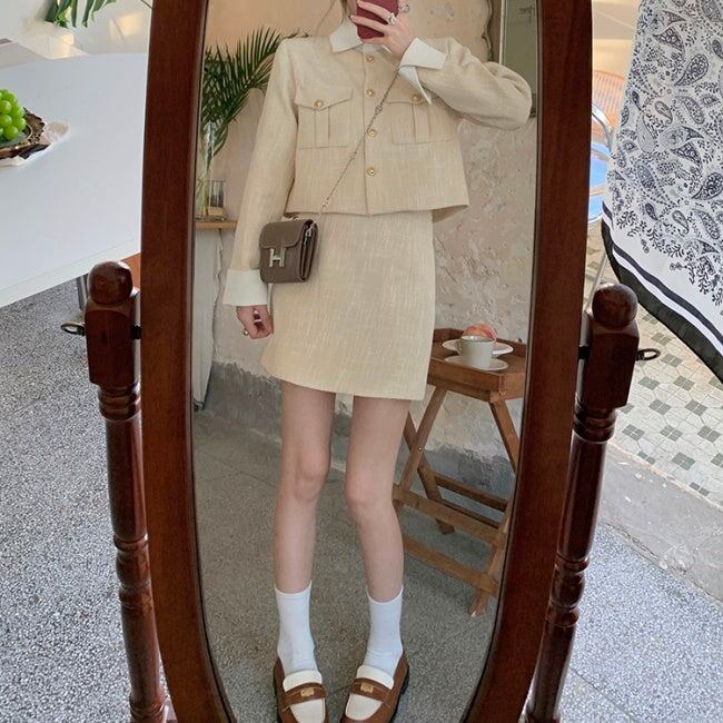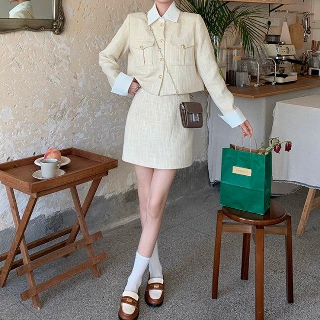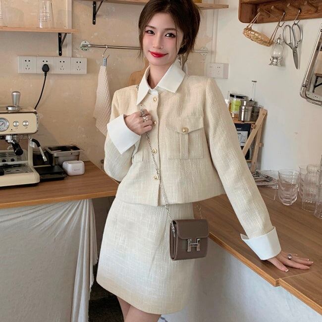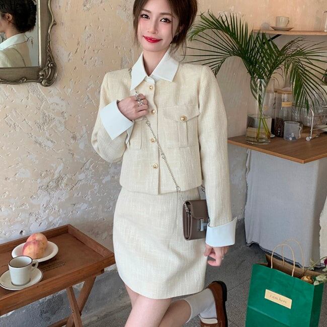 スーツ ジャケット セットアップ レディース 韓国 ファッション ロングスカート ミニスカート 金ボタン ジャガード