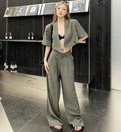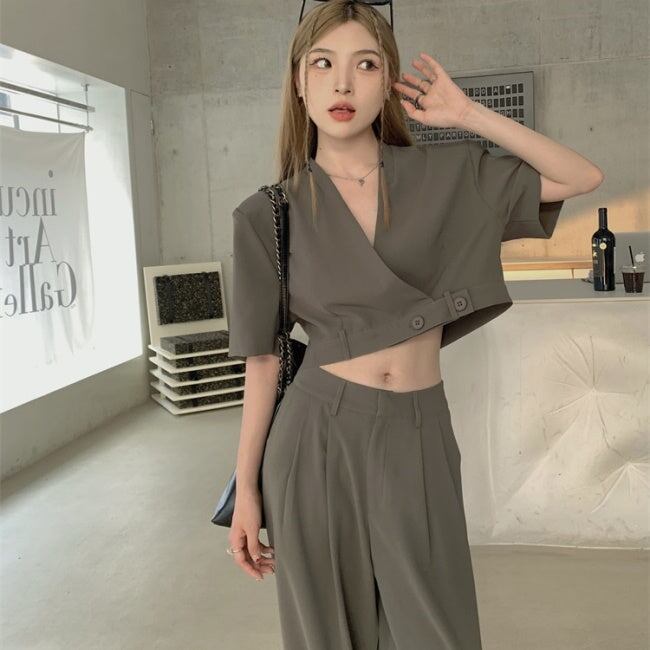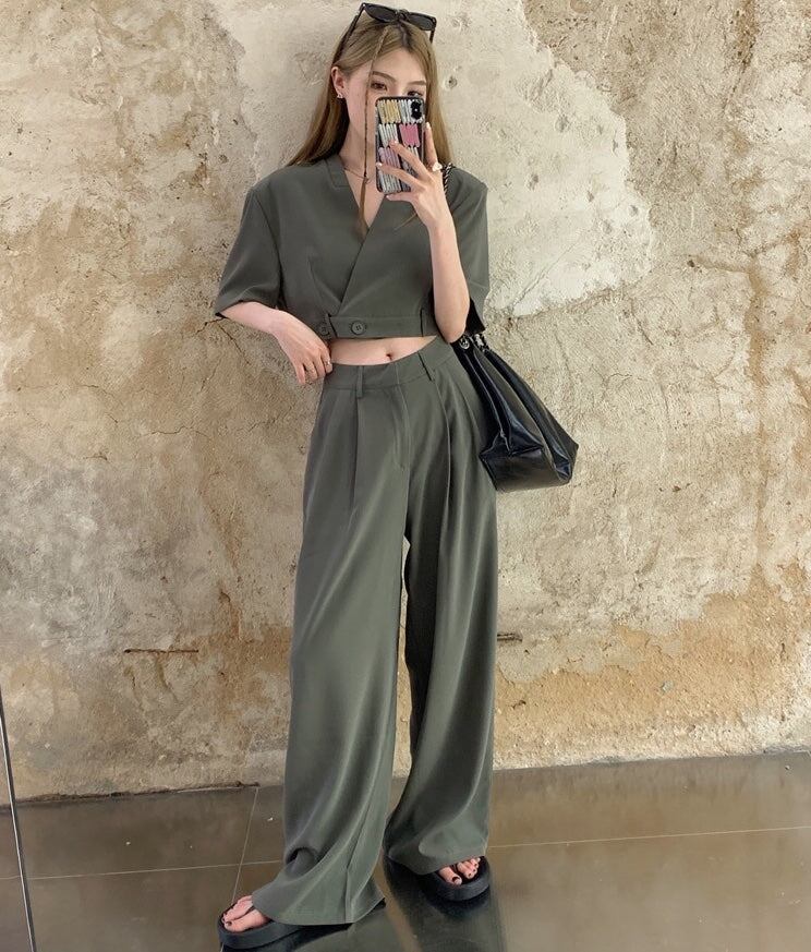 セットアップ Vネックシャツ ワイドパンツ レディース 韓国 ファッション 夏 クロップド シャツ 半袖 フレアパンツ タックパンツ 大人カジュアル ロングパンツ