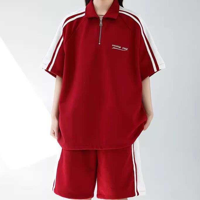 セットアップ ハーフパンツ レディース 韓国 ファッション ポロシャツ スキッパー ハーフジップ ショートパンツ サイドライン ワンポイントロゴ ストリート カジュアル