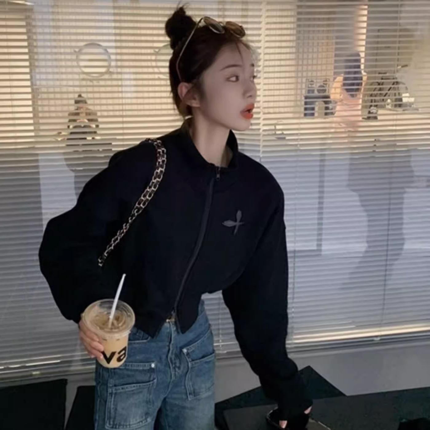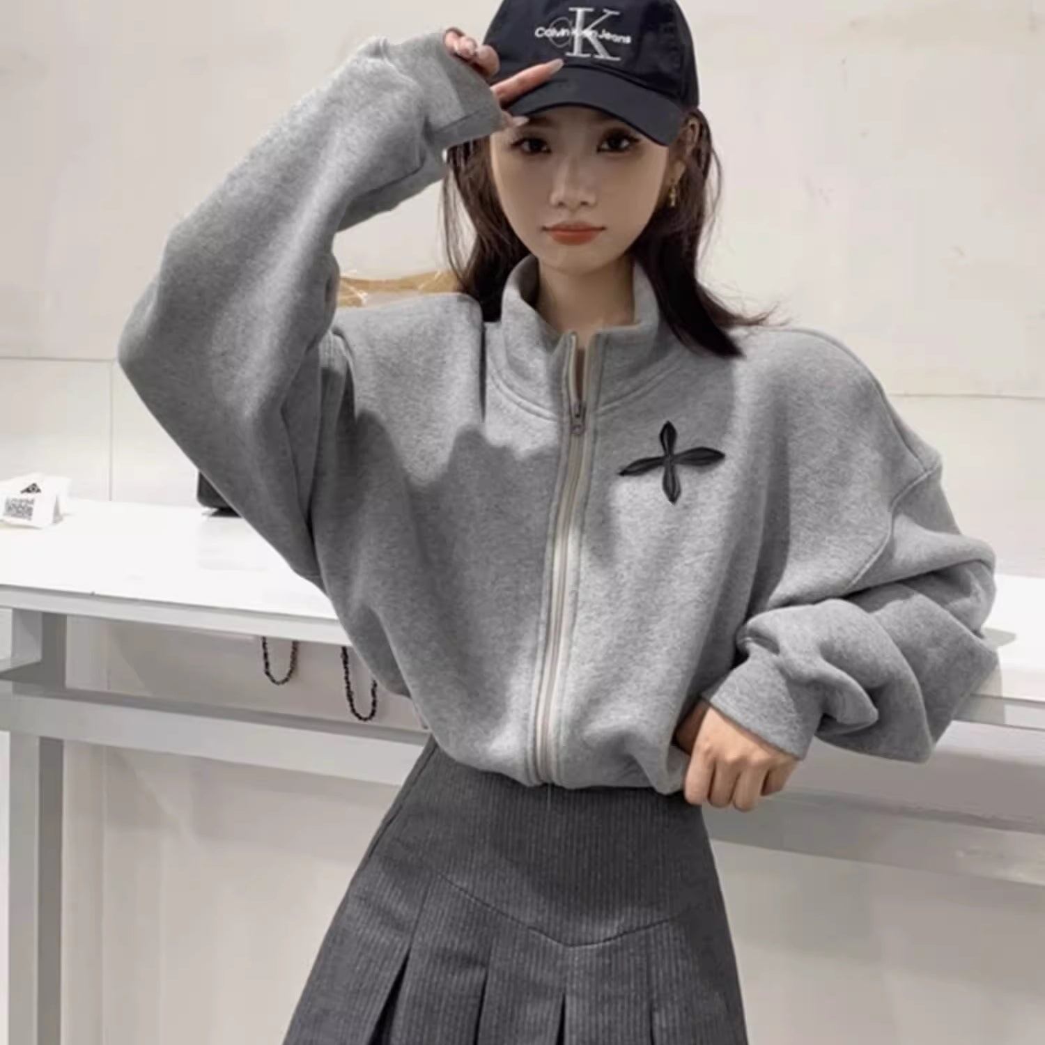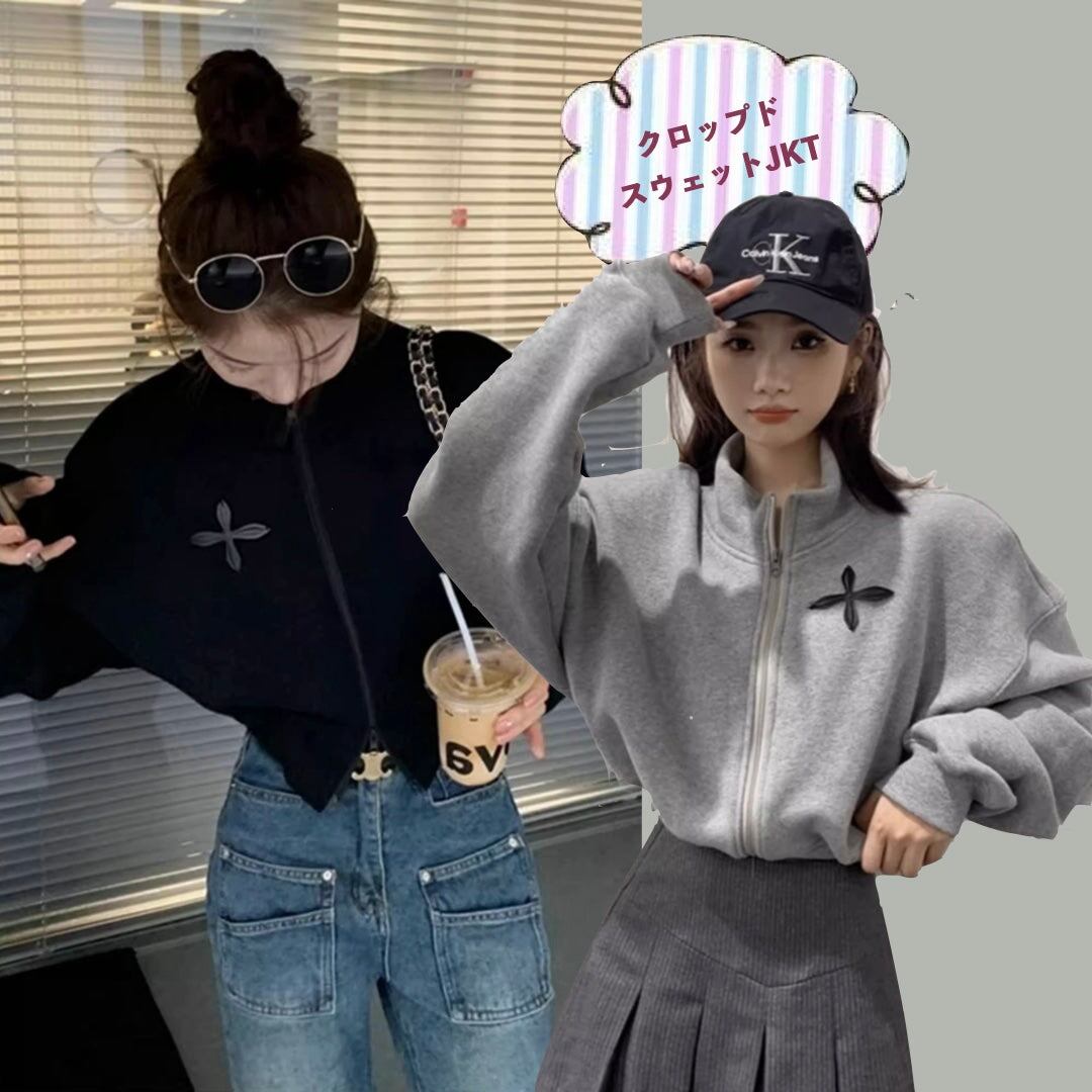 ブルゾン ジップスウェット レディース 韓国 ファッション ショート丈 ジャケット アウター スウェットトップス ノーカラ— ダブルジップ ワンポイント スタンドネック