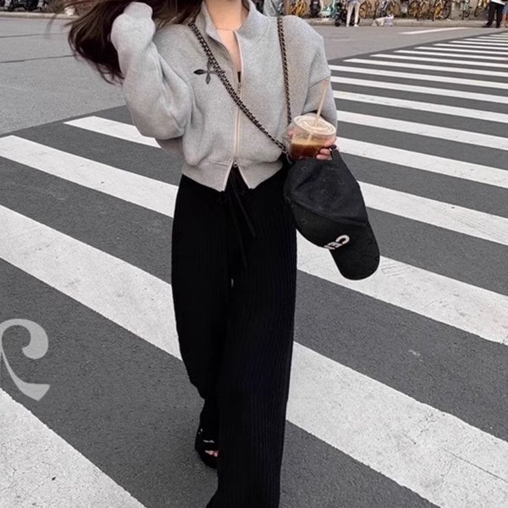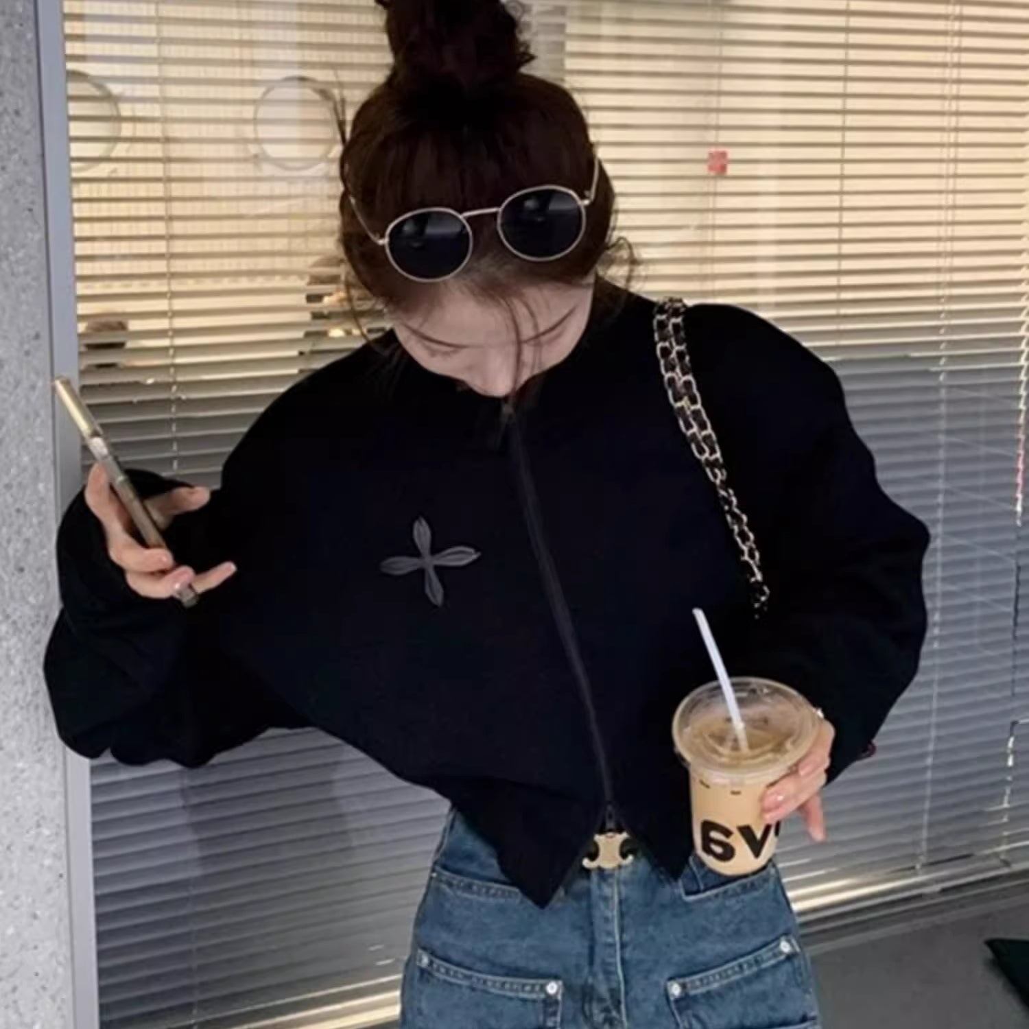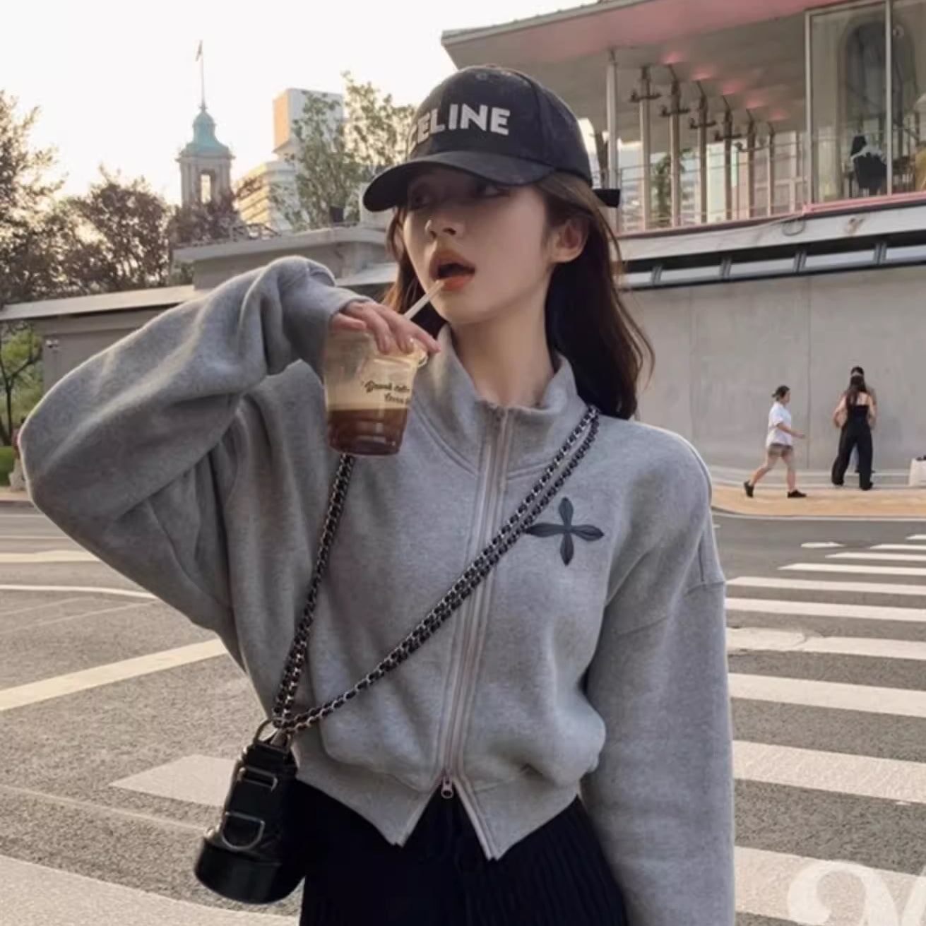 ブルゾン ジップスウェット レディース 韓国 ファッション ショート丈 ジャケット アウター スウェットトップス ノーカラ— ダブルジップ ワンポイント スタンドネック