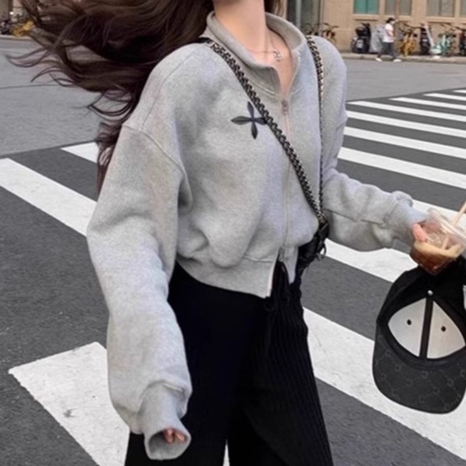 スウェット ジャケット クロップド ハイネック ジップ トレーナー 韓国 ファッション ショート丈 ワンポイント ワッペン刺繍 トップス