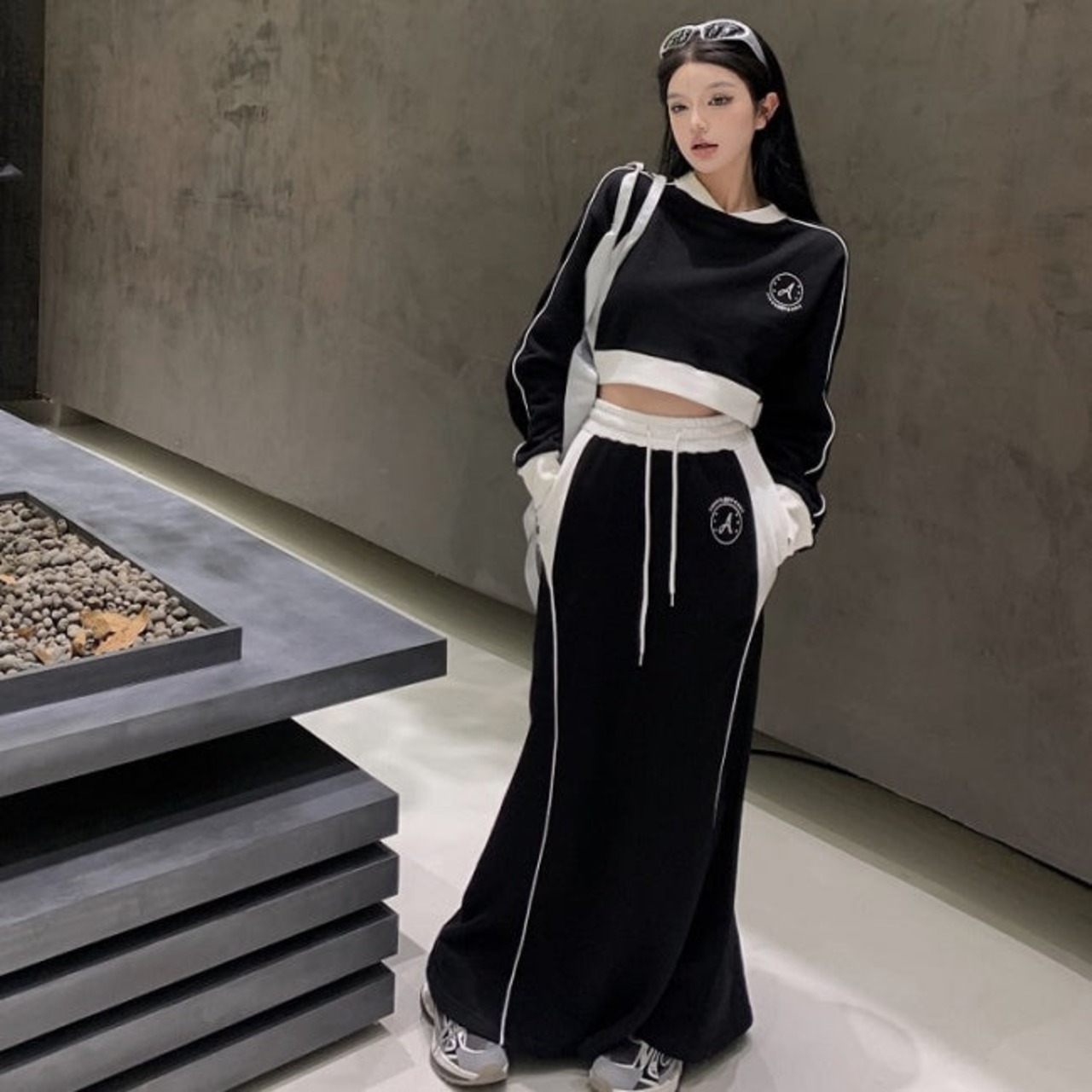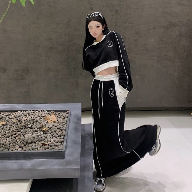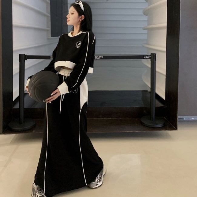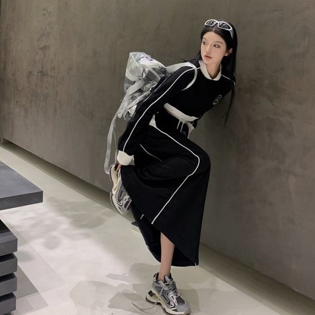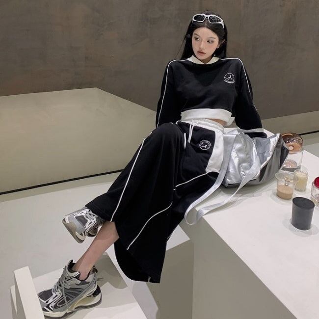 スウェット ジャージ セットアップ レディース ロングスカート 韓国 ファッション サイドライン クロップトレーナー ロングスカート 上下セット