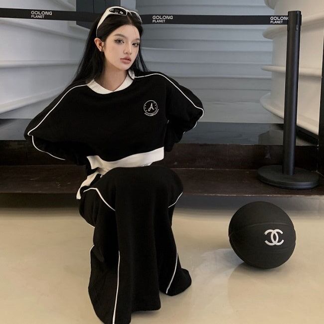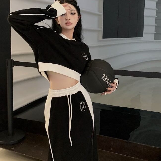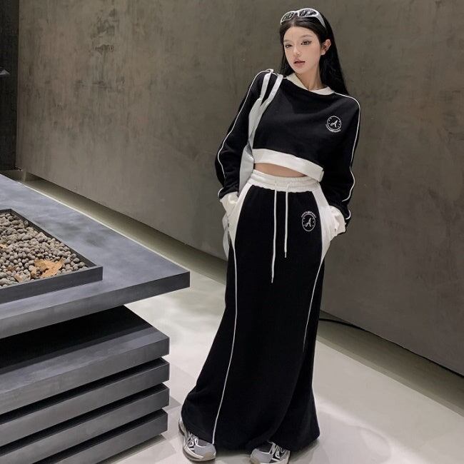 セットアップ スポーツミックス レディース 韓国 ファッション サイドライン おしゃれジャージ スウェットセットアップ クロップトレーナー ショート丈 ロングスカート モノトーン ロゴプリント おしゃれ