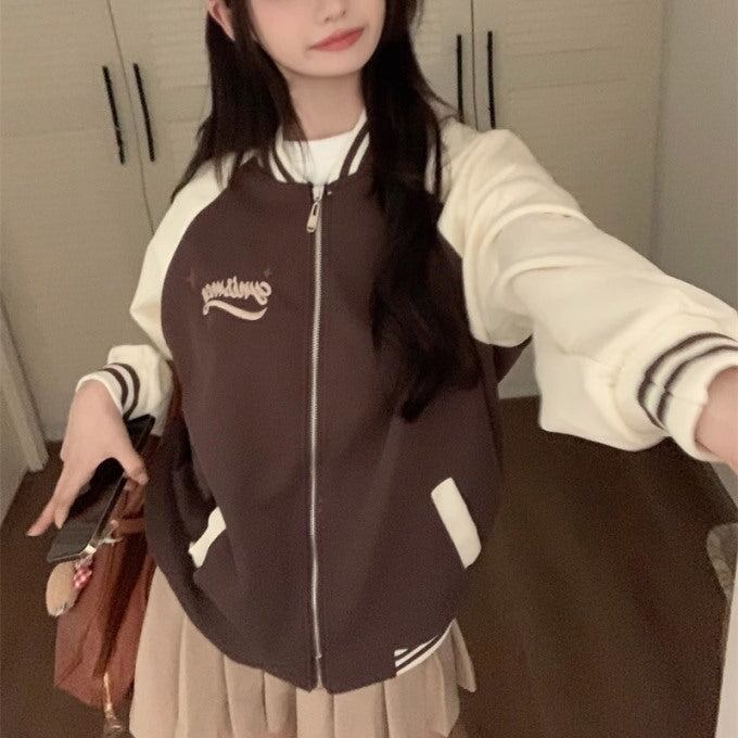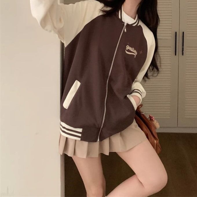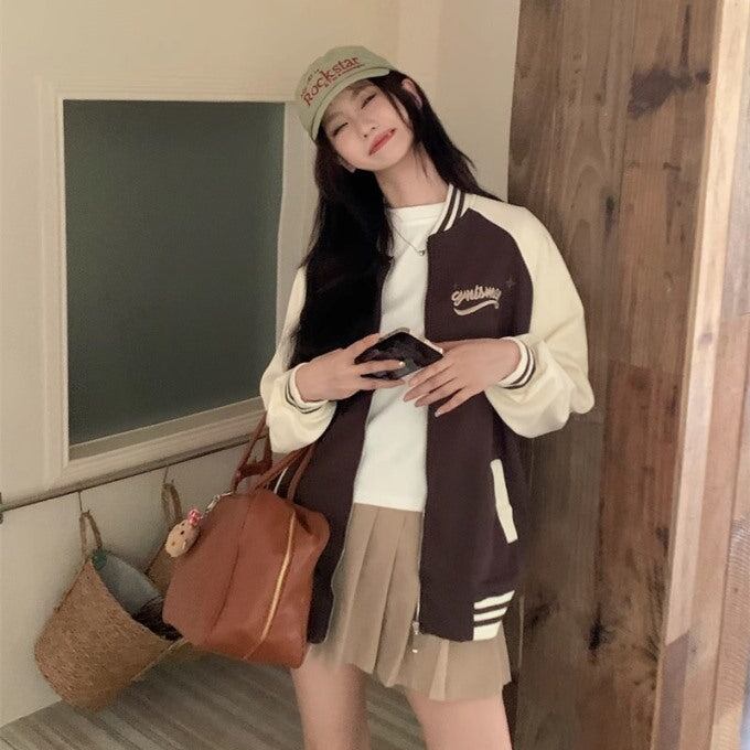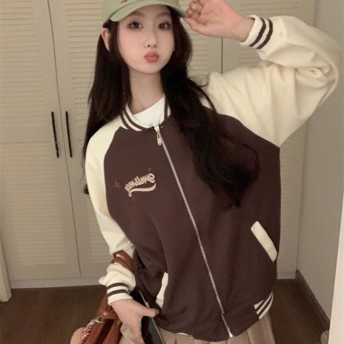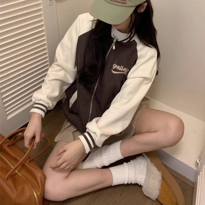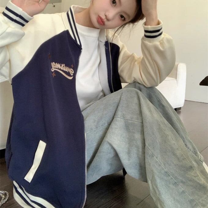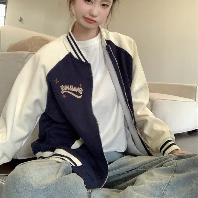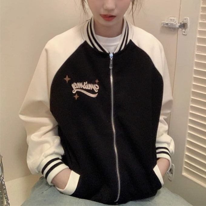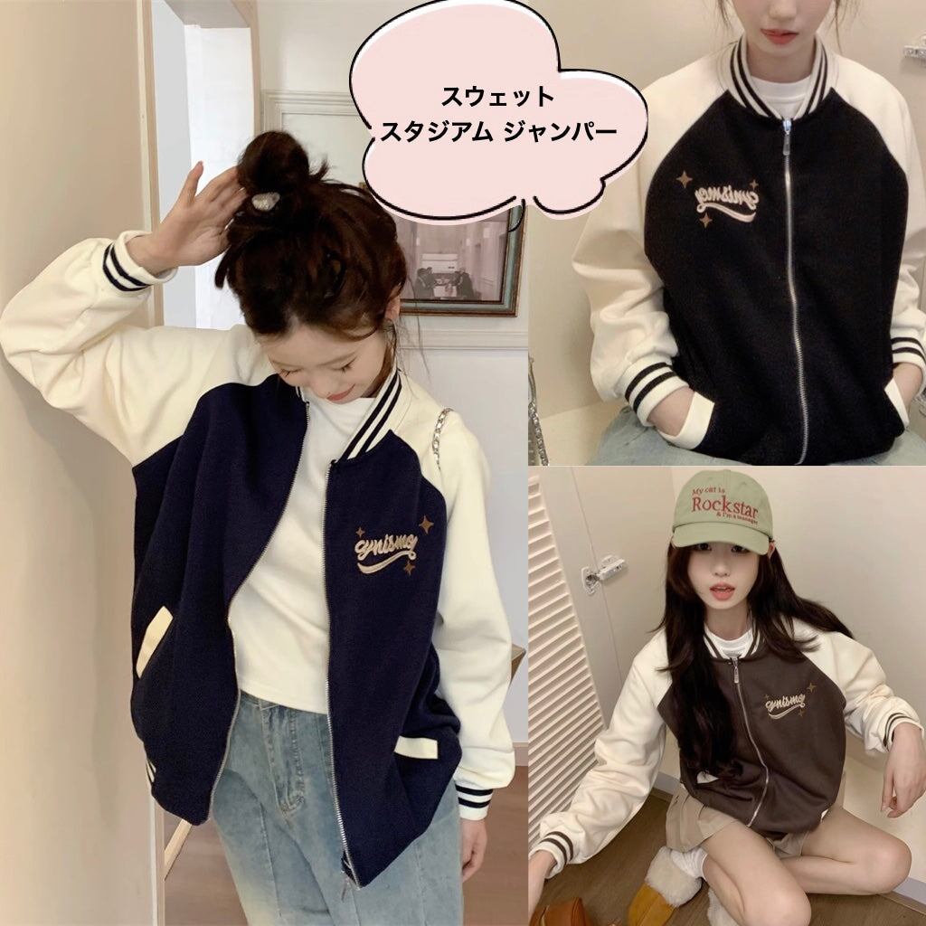 スタジャン アウター ジップブルゾン レディース 韓国 ファッション バイカラー ラグラン ワンポイントロゴ オーバーサイズ フリーサイズ 春秋アウター