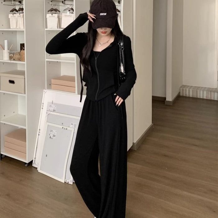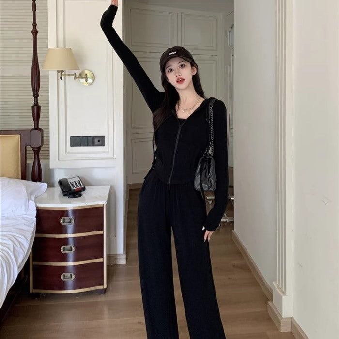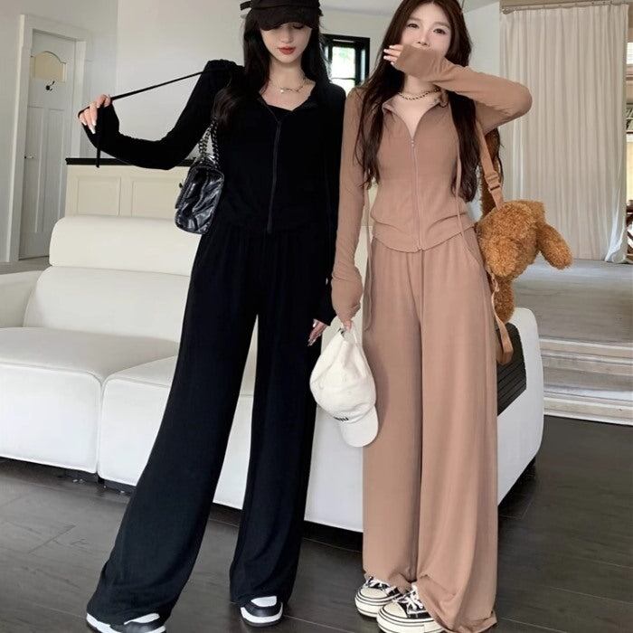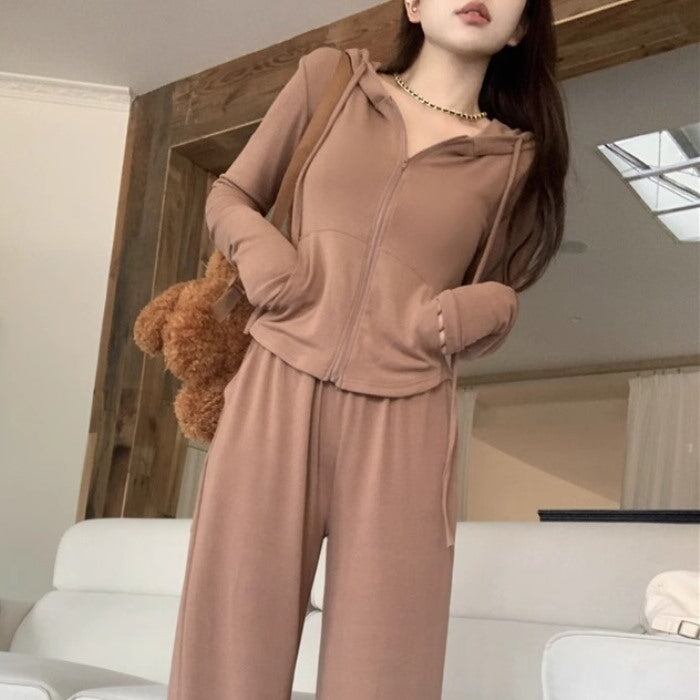 スウェット セットアップ ジップパーカー レディース 韓国 ファッション ストレッチ クロップド パーカー ワイドパンツ セット