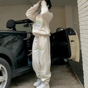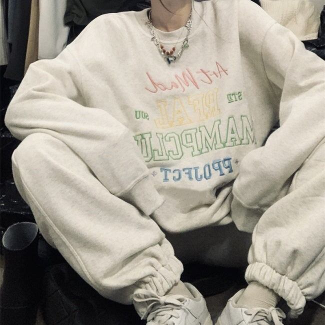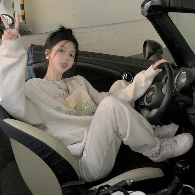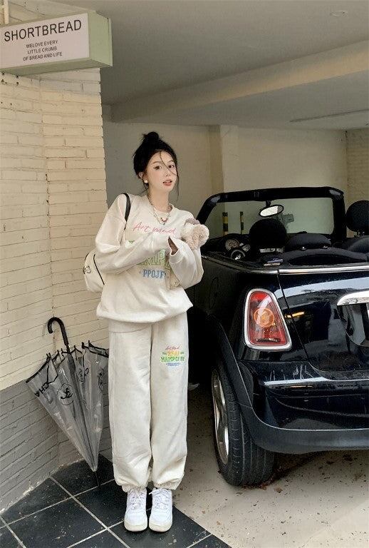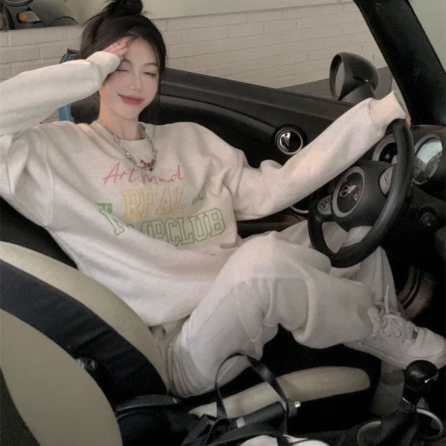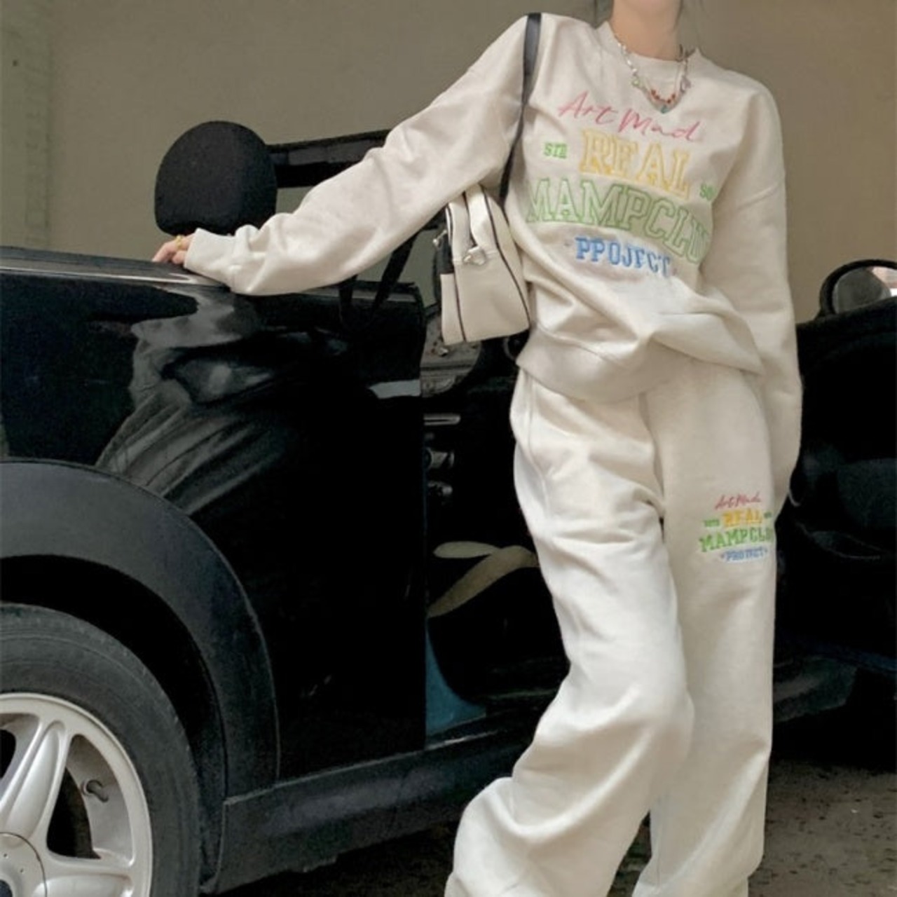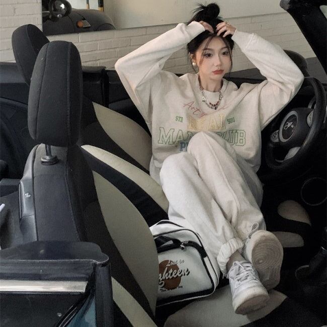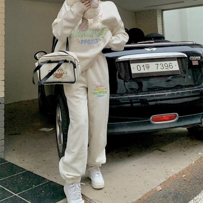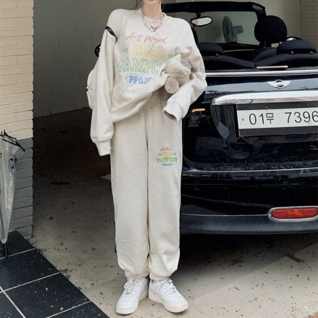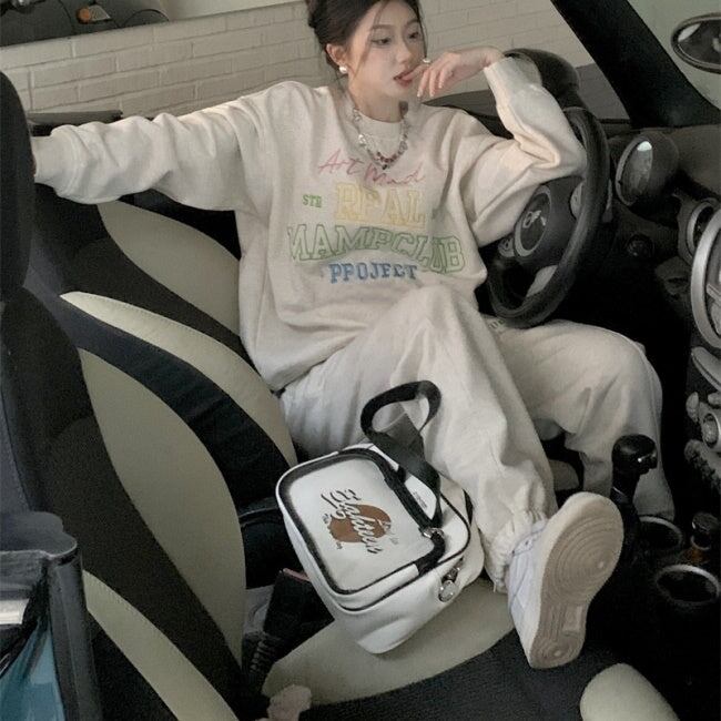 スウェットセットアップ ロゴ レディース 韓国 ファッション スポーツ トレーナー ジョガーパンツ クルーネック オフホワイト おしゃれ ジャージ
