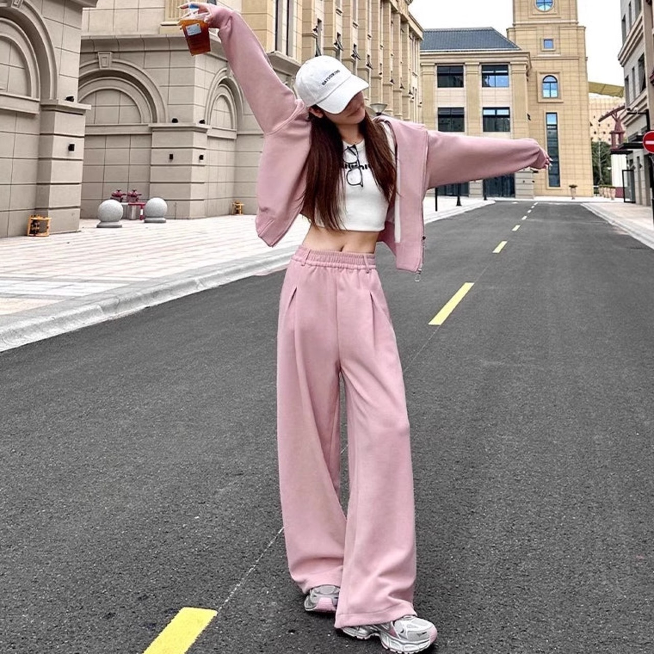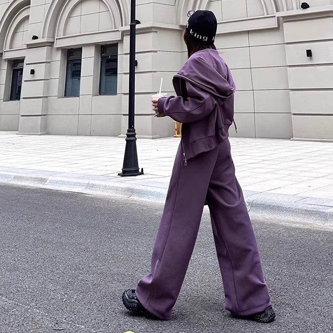 スウェット セットアップ レディース パーカー 韓国 ファッション ジップパーカー ワイドパンツ 上下セット パープル カーキ ピンクpinnku