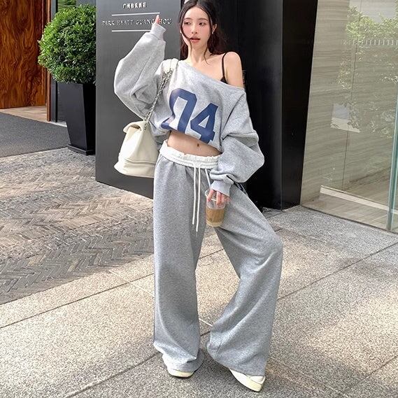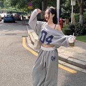セットアップ? スウェット レディース 韓国 ファッション オフショル トレーナー ジョガーパンツ スウェットパンツ 上下セット ナンバーロゴ プリント