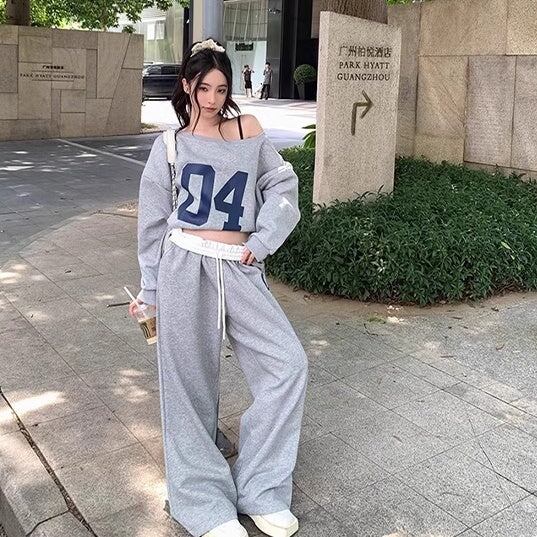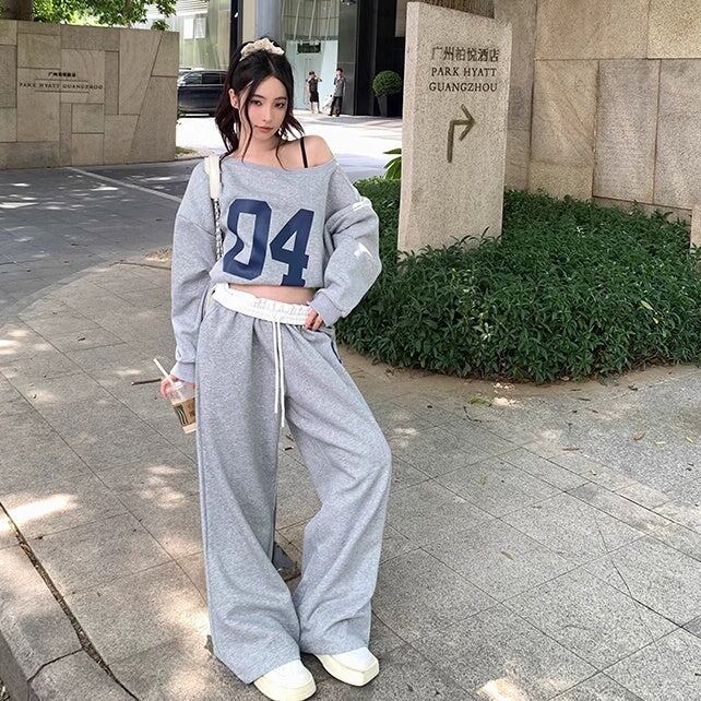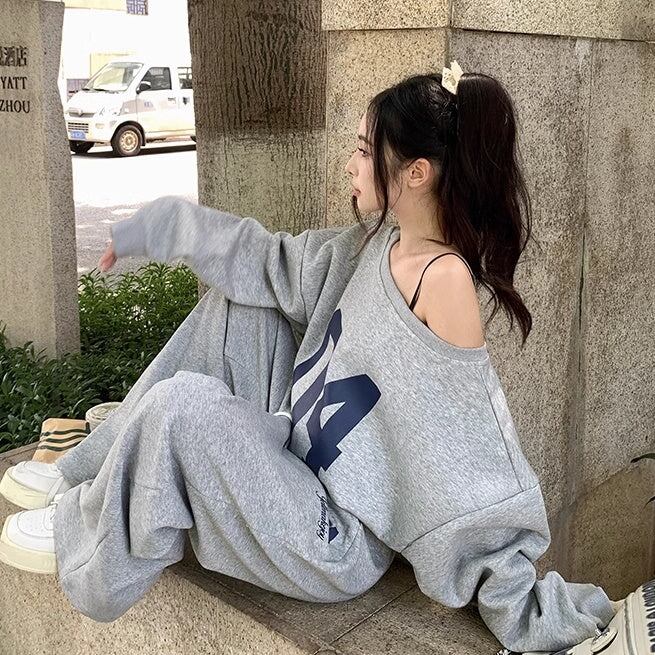 スウェット セットアップ レディース 韓国 ファッション オフショル オーバサイズ トレーナー スウェットパンツ 上下セット ナンバーロゴ プリント