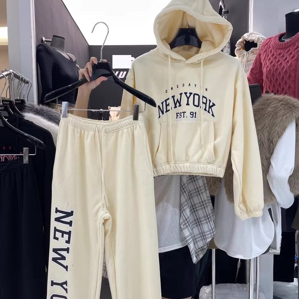 スウェットセットアップ レディース 韓国 ファッション ロゴプリント カンガルーポケット プルオーバー ショートパーカー クロップドパーカー 裾ゴム スウェットパンツ ジョガーパンツ