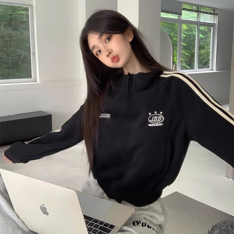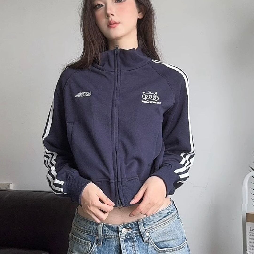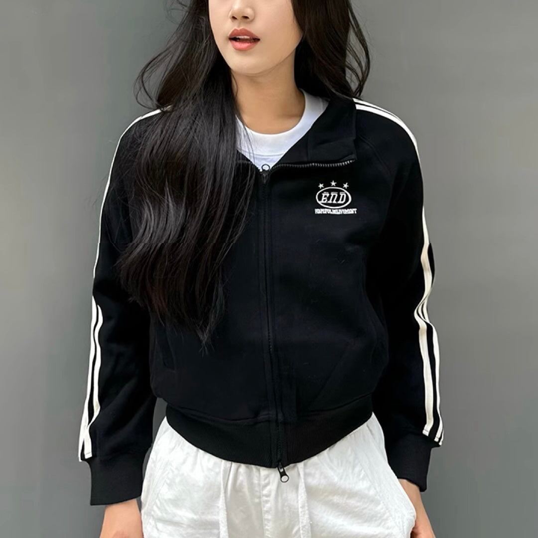 ジャージジャケット レディース 韓国 ファッション クロップド丈 ショート丈 袖ライン ロゴ刺繍 モノトーン トラックトップ ストリートカジュアル
