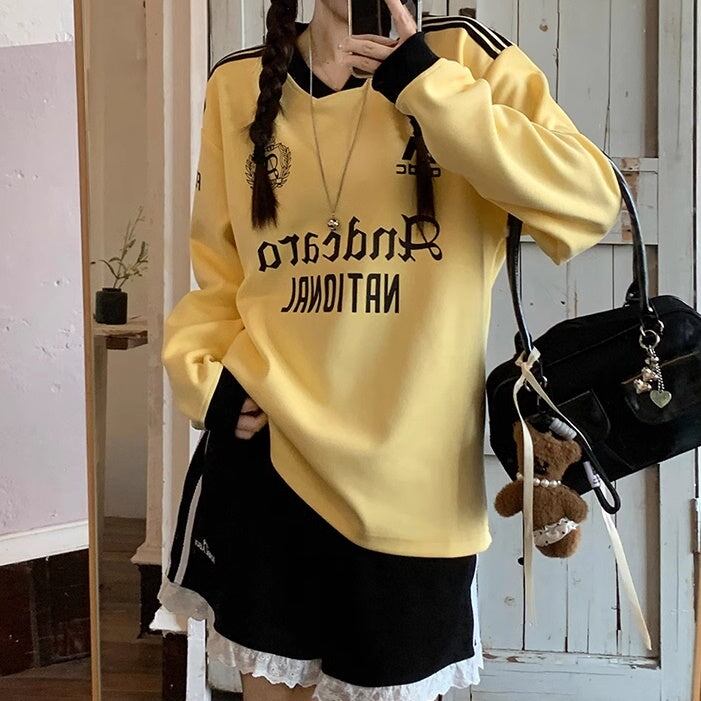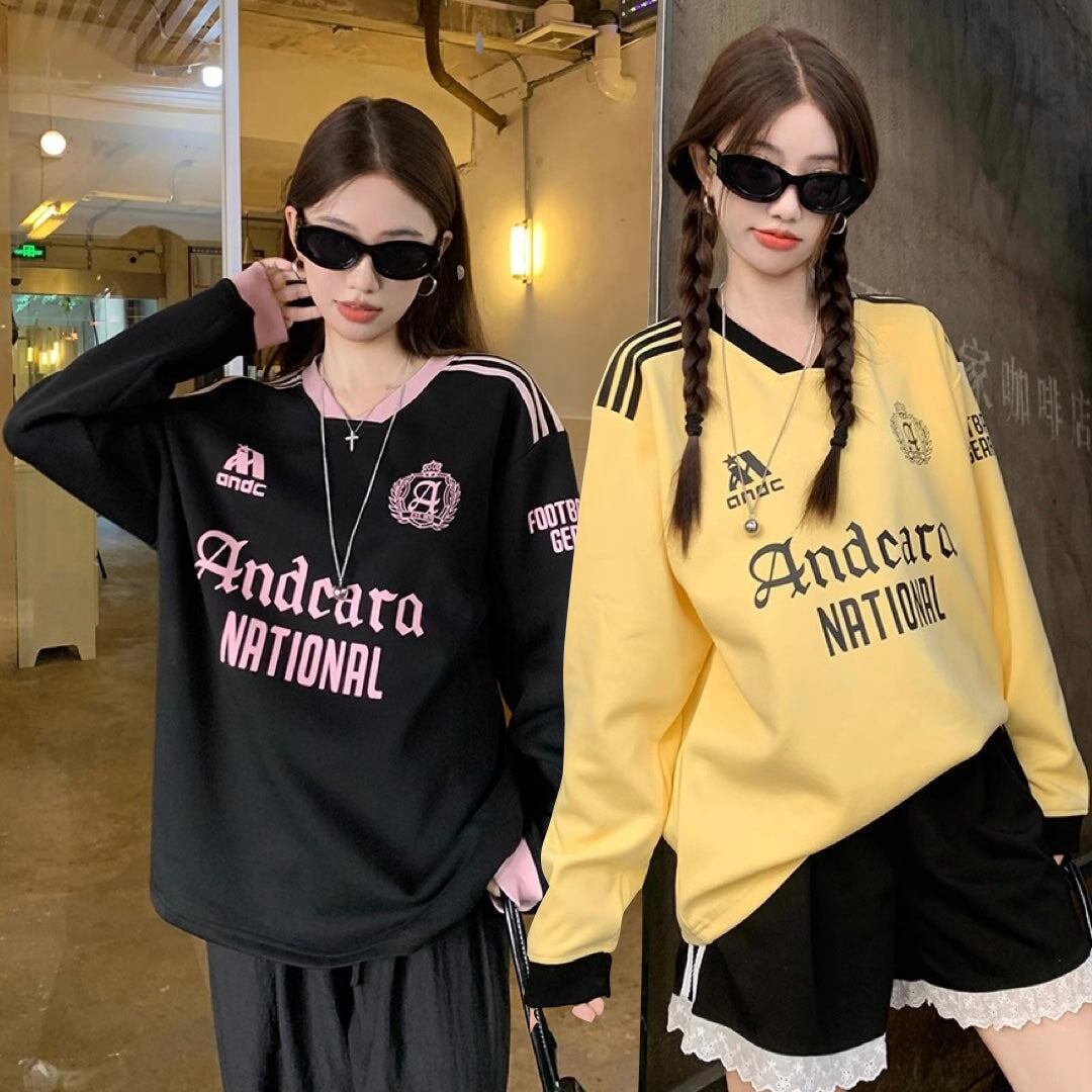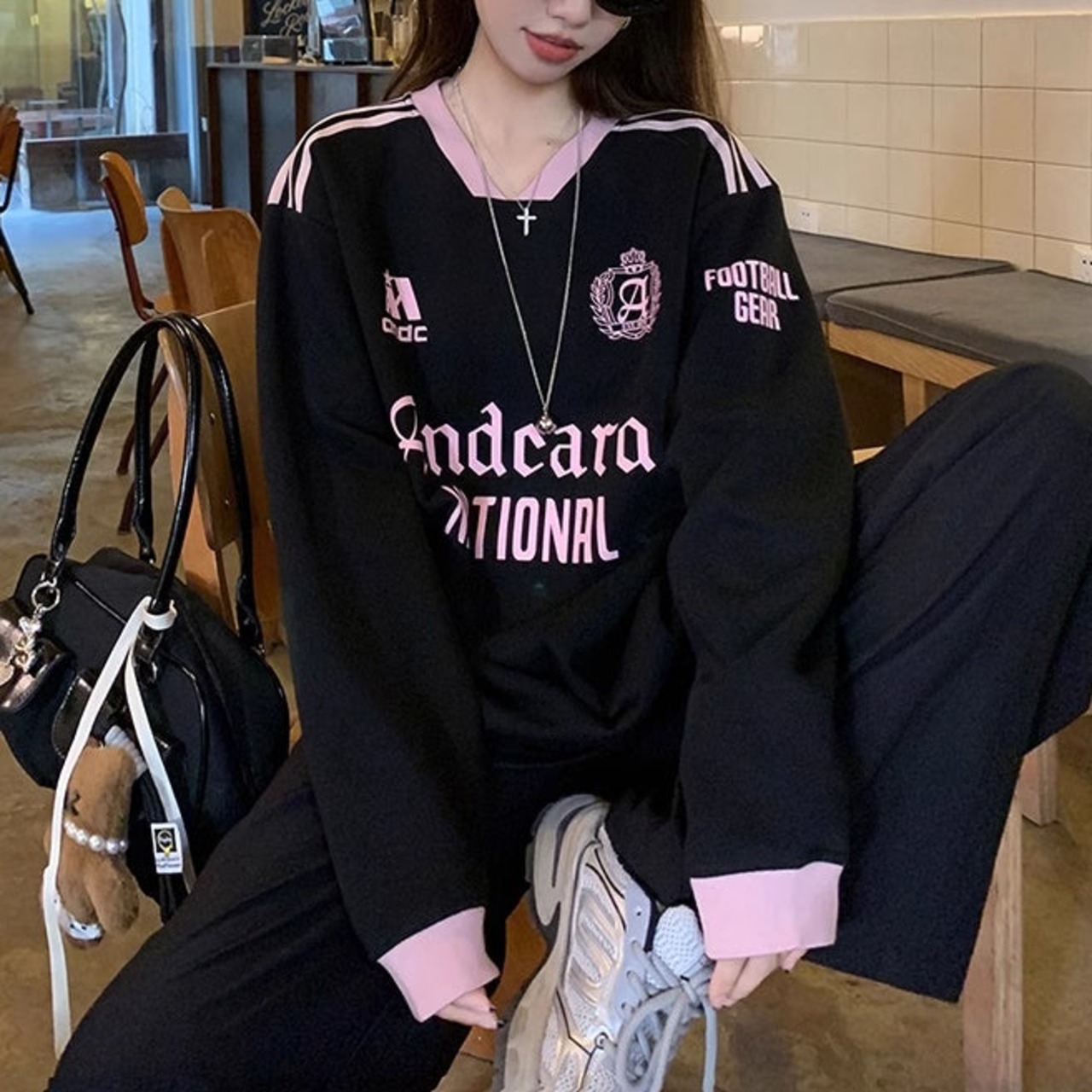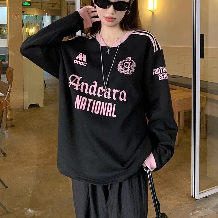 スウェット トレーナー レディース Vネック ライン スポーティー 韓国 ファッション ロゴ トップス ビッグシルエット