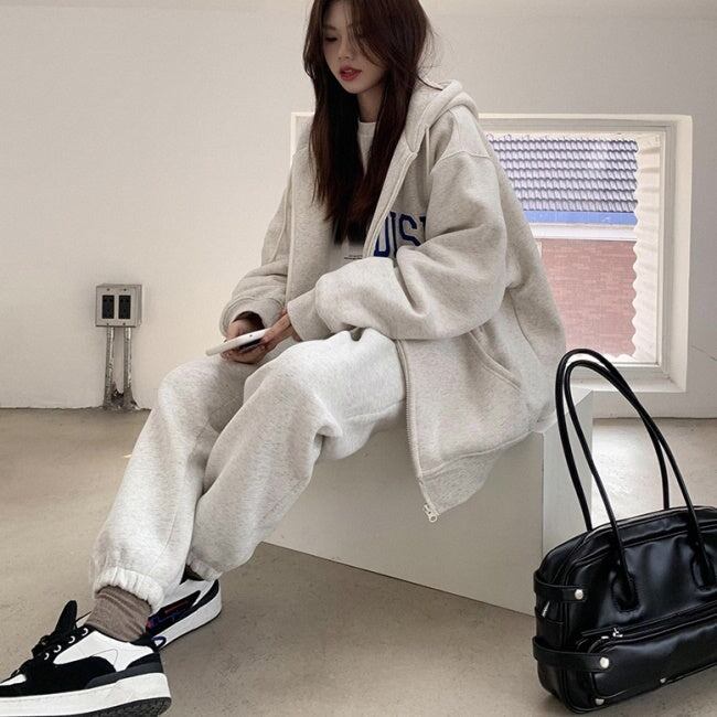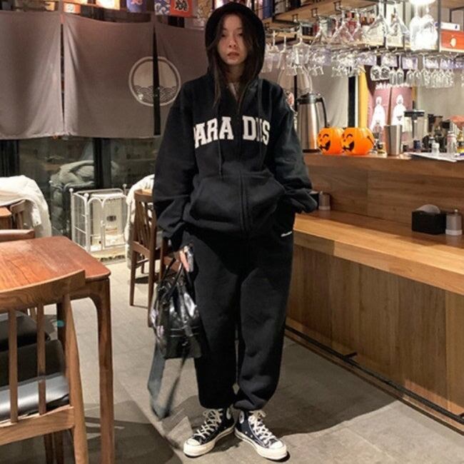 スウェット セットアップ パーカー レディース 韓国 ファッション ジョガーパンツ スウェットパンツ ジップパーカー ロゴ アップリケ 2点セット ツーピース