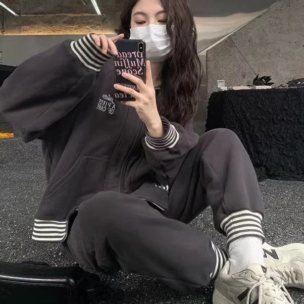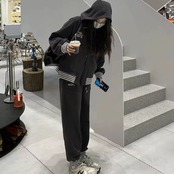 スウェットセットアップ パーカー レディース 韓国 ファッション ロゴプリント ボーダー グレー スウェットパンツ 裾ゴムパンツ ジョガー