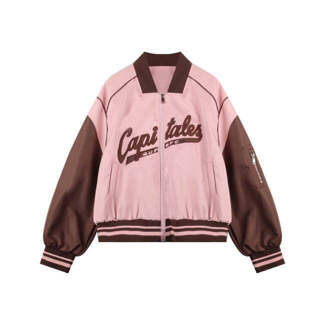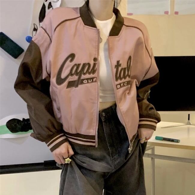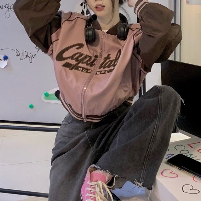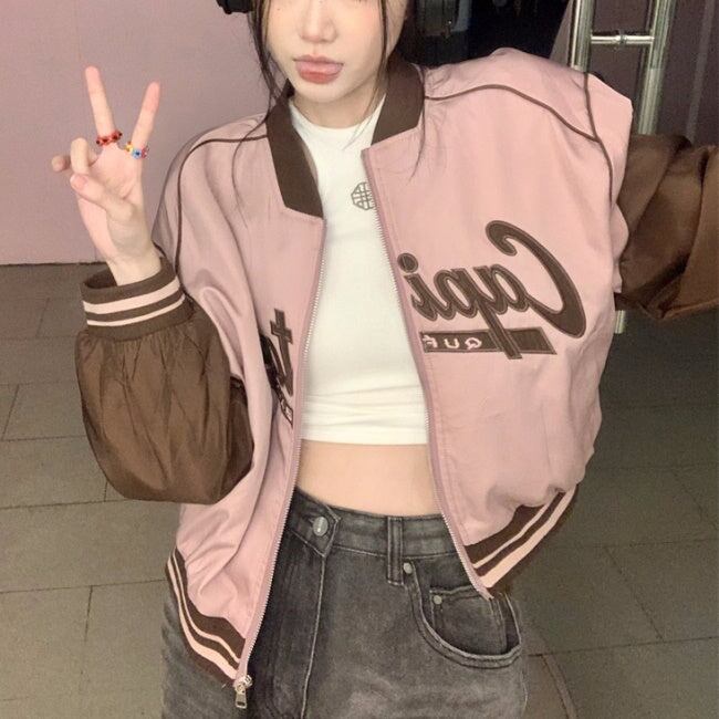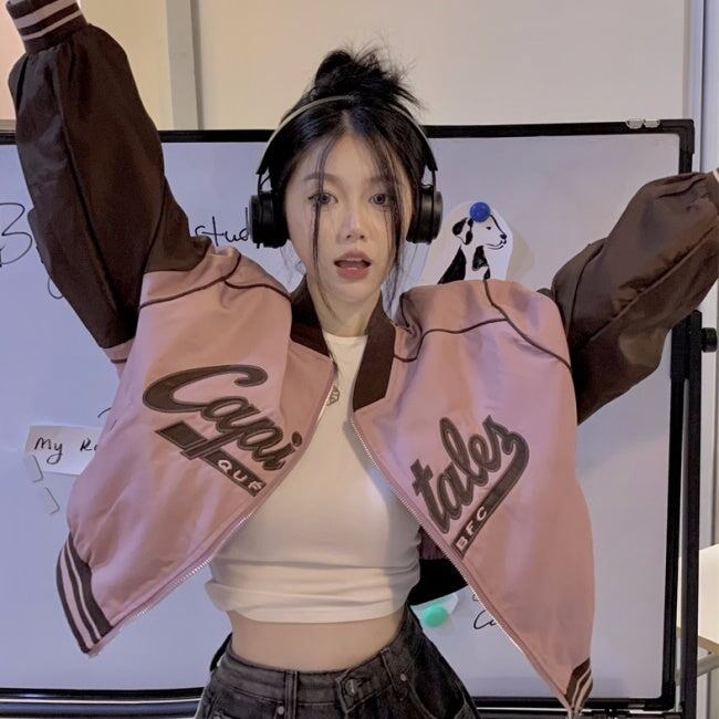 スカジャン ベースボールジャケット レディース 韓国 ファッション ロゴ ジップブルゾン ラグラン バイカラー ガーリー クロップド ショートジャケット 春 アウターac07262