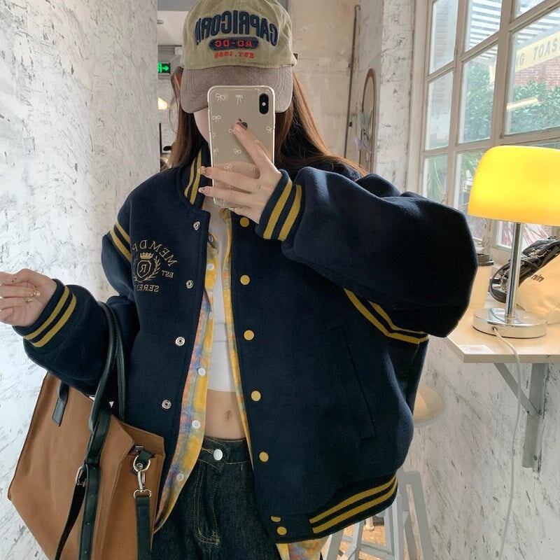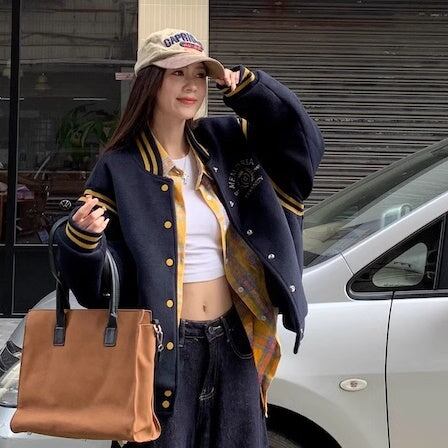 スタジャン アウター レディース 韓国 ファッション -バーサイズ ビッグシルエット ロゴマーク ラインデザイン メンズライク カレッジコーデ