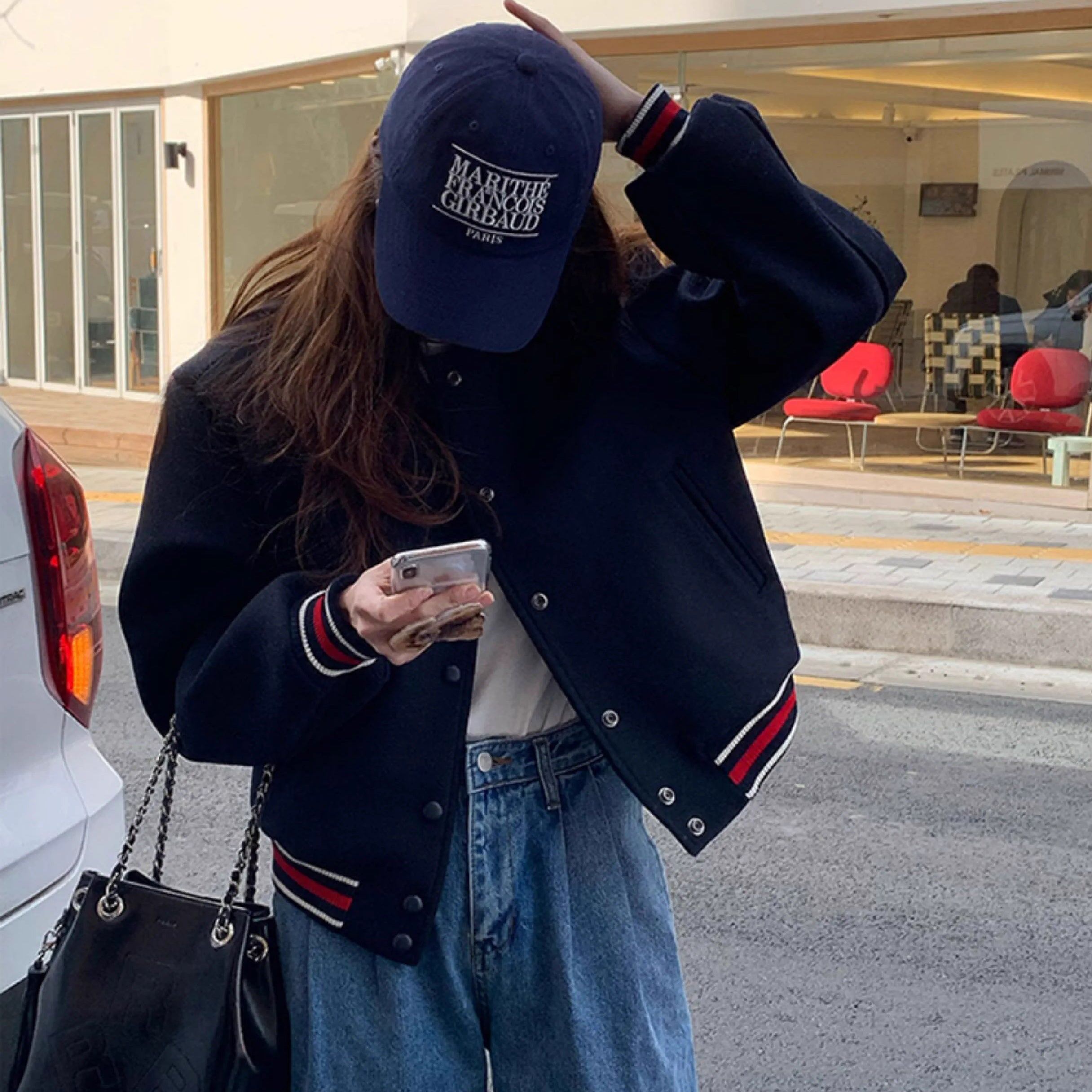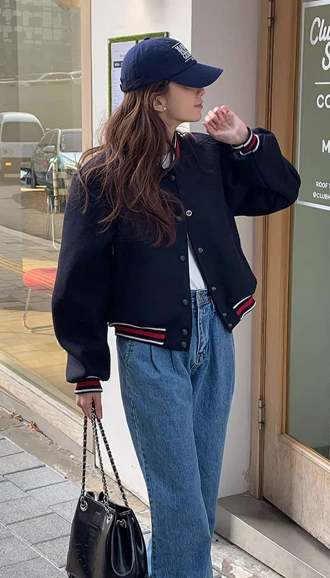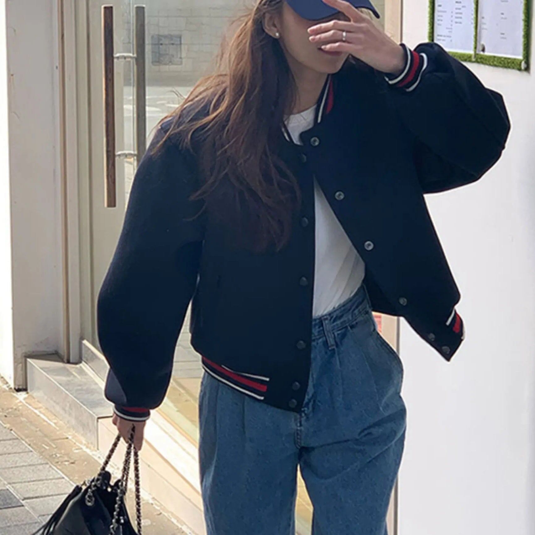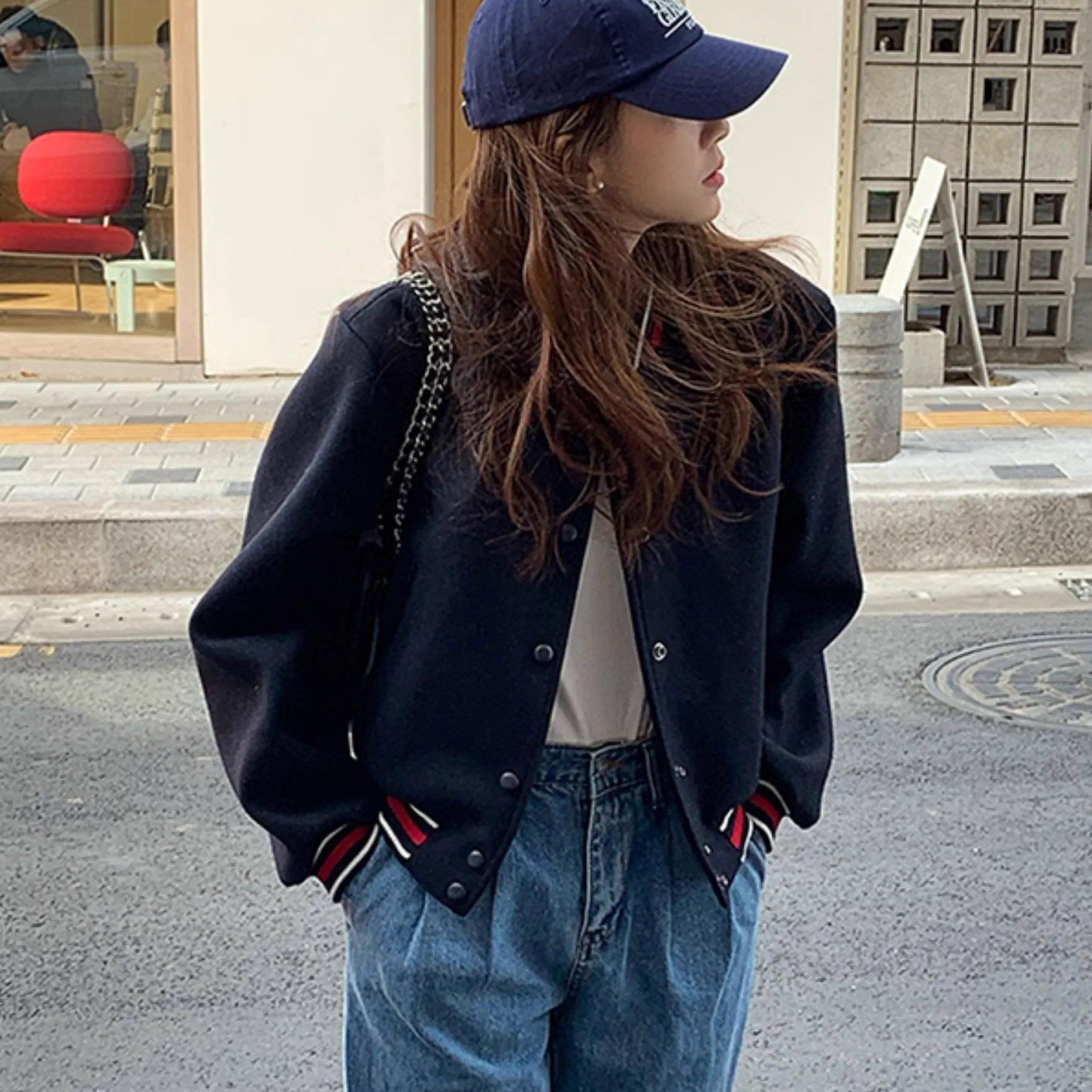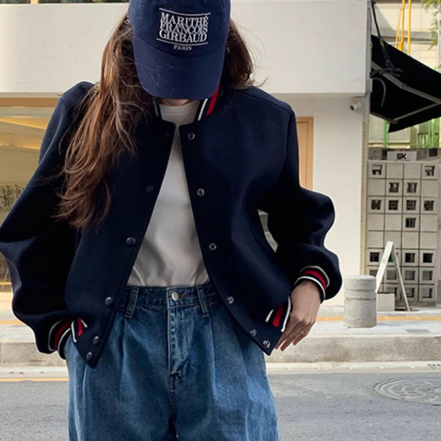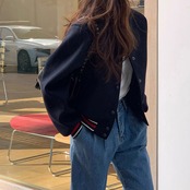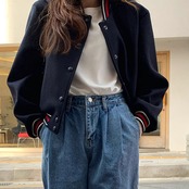 ショート丈のスタジアムジャンバー