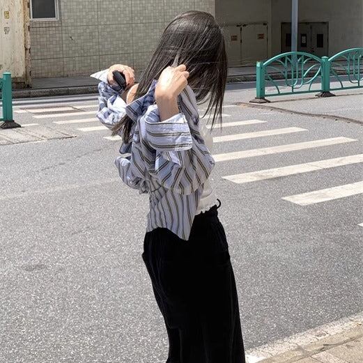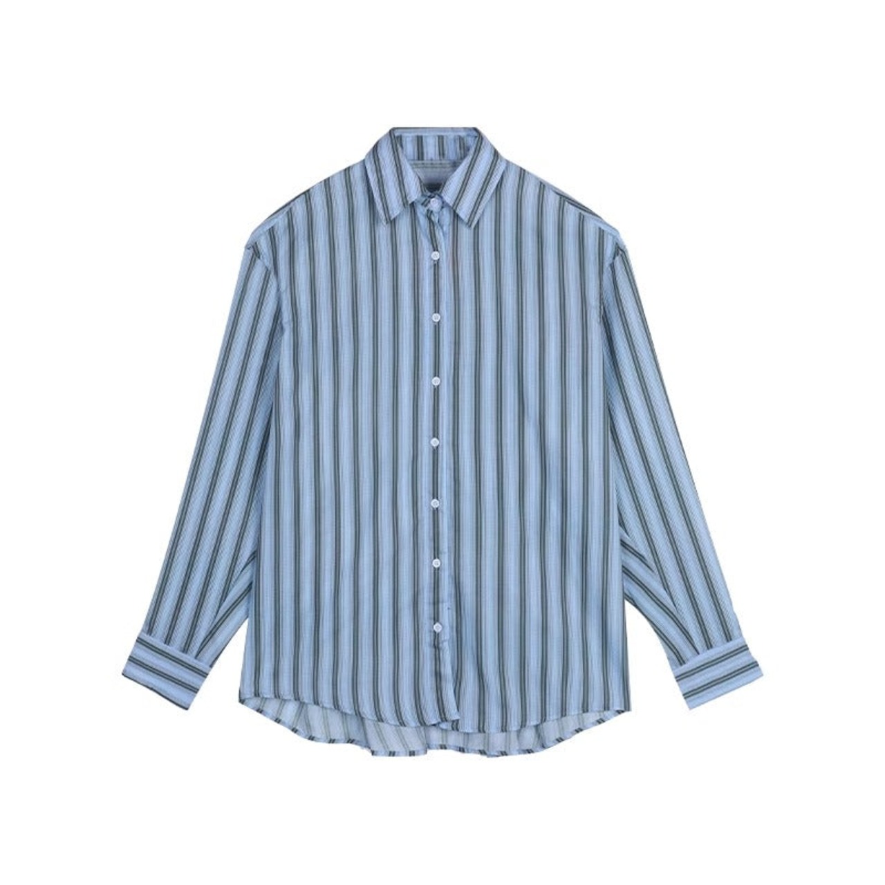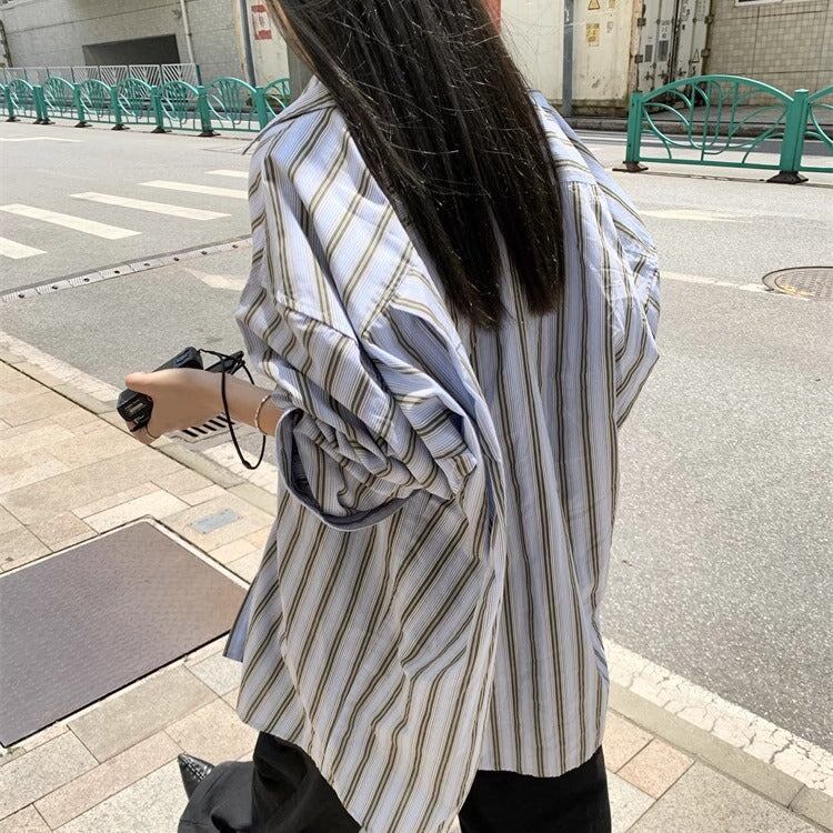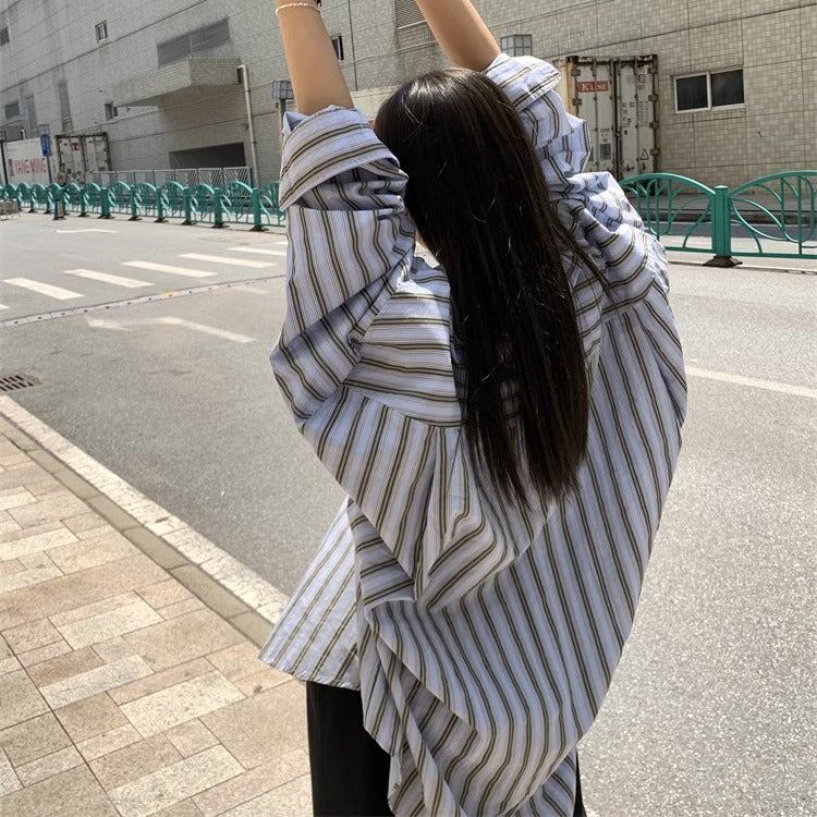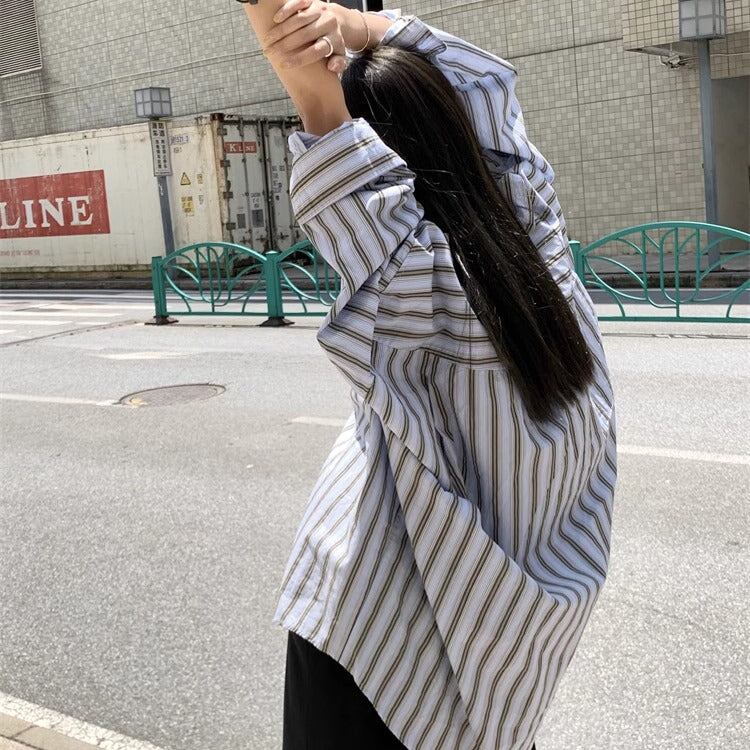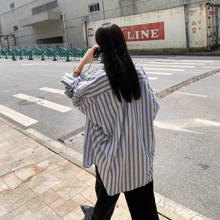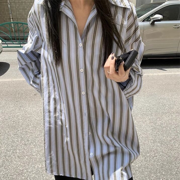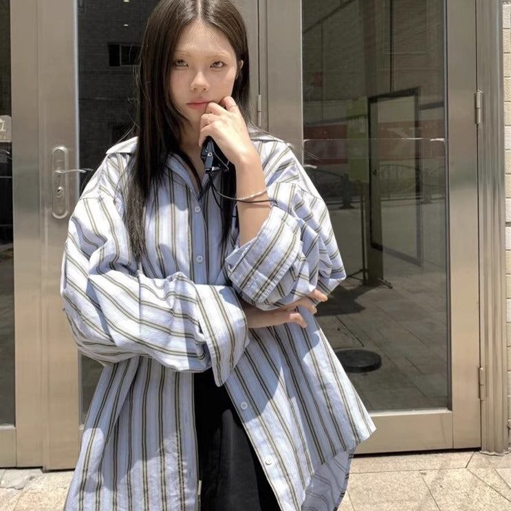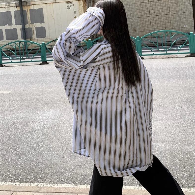 長袖シャツ ストライプ オーバーサイズ レディース 韓国 ファッション ロング丈 ビッグシルシルエット エアリー